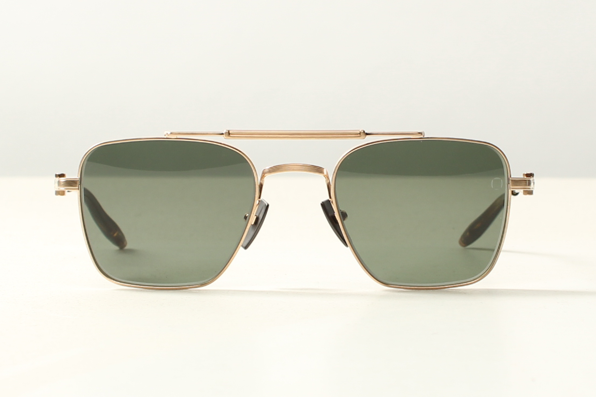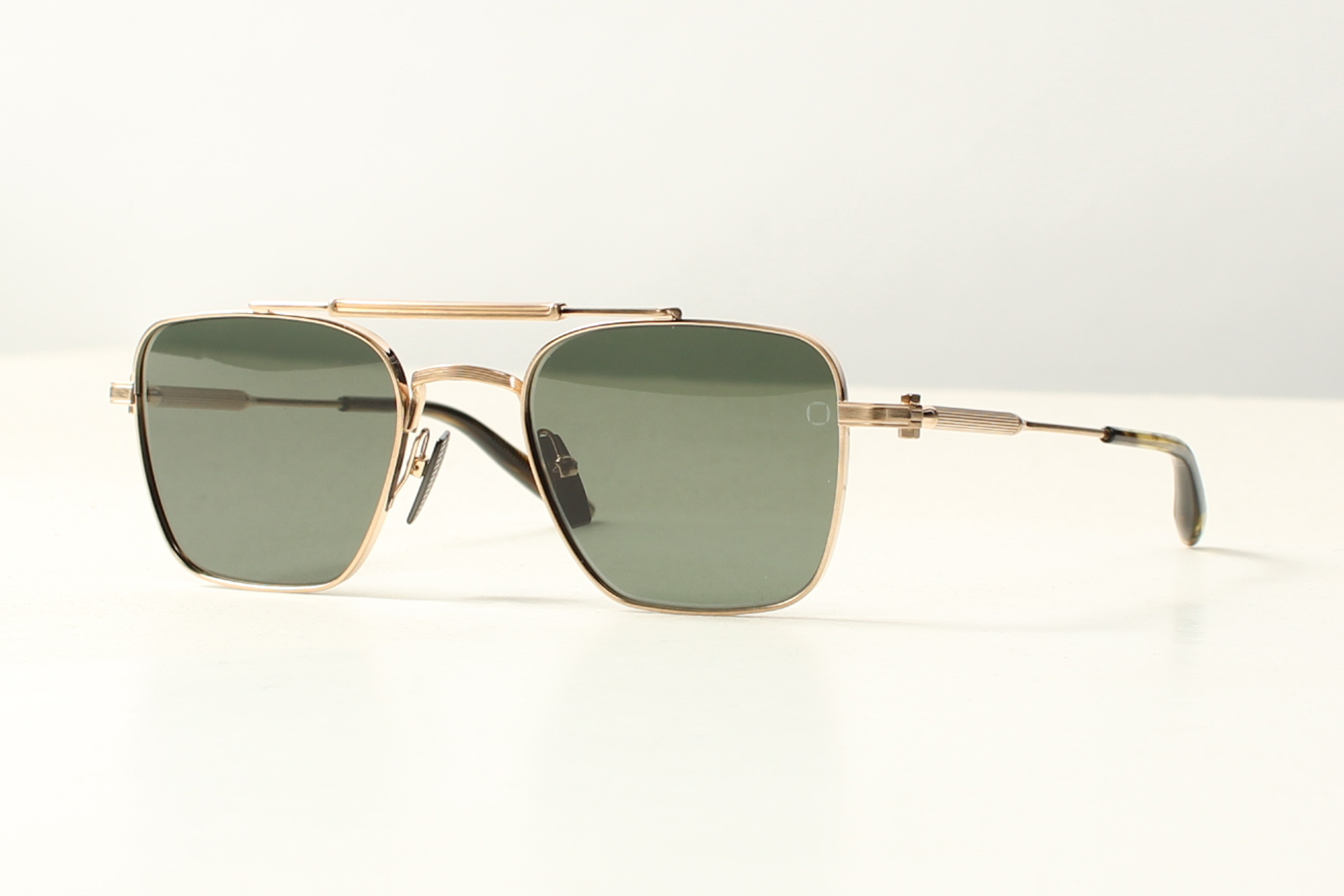 Zonnebril van Akoni model Europa. Montuur in mat bronskleurig titanium frame. Met grijs-groene glazen