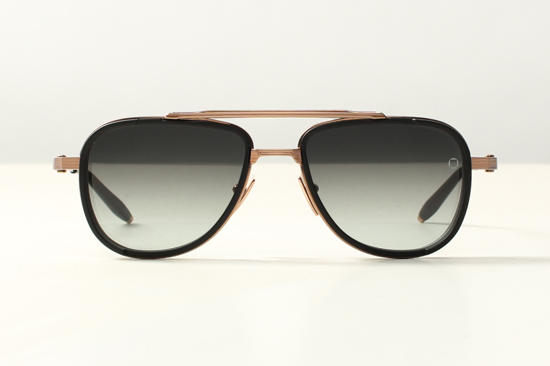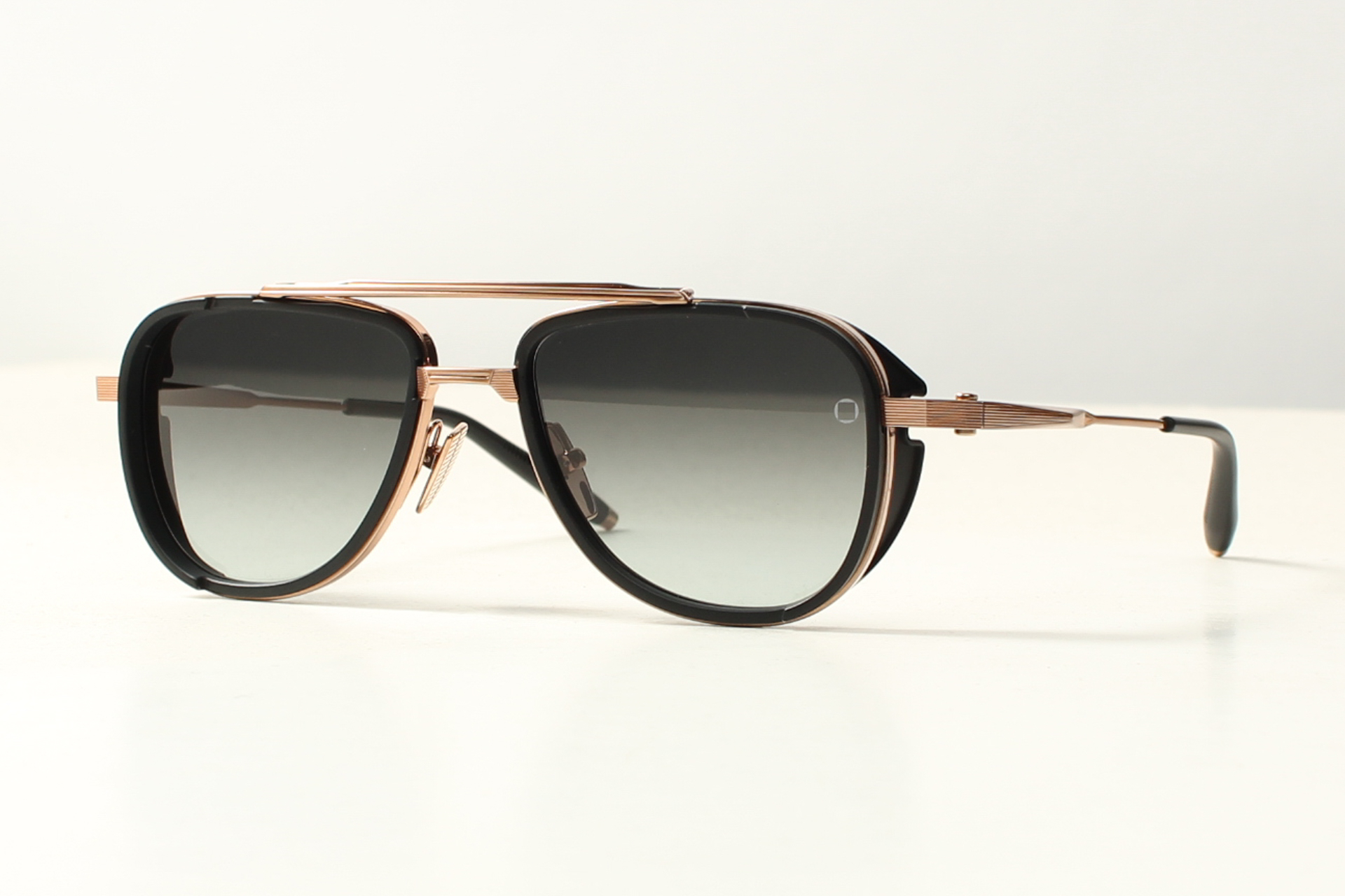 Zeer fraaie zonnebril van Akoni model Spitzer. Gedetailleerd montuur met zwart acetaat randen in rose-goud titanium frame. Grijze degrade glazen.