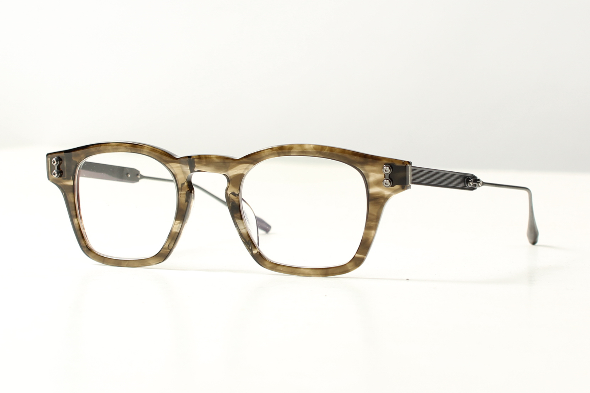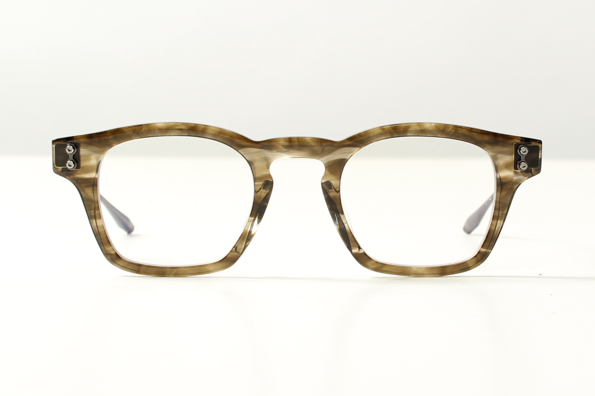 Montuur van Akoni in bruin gevlamd Japans acetaat met titanium veren.