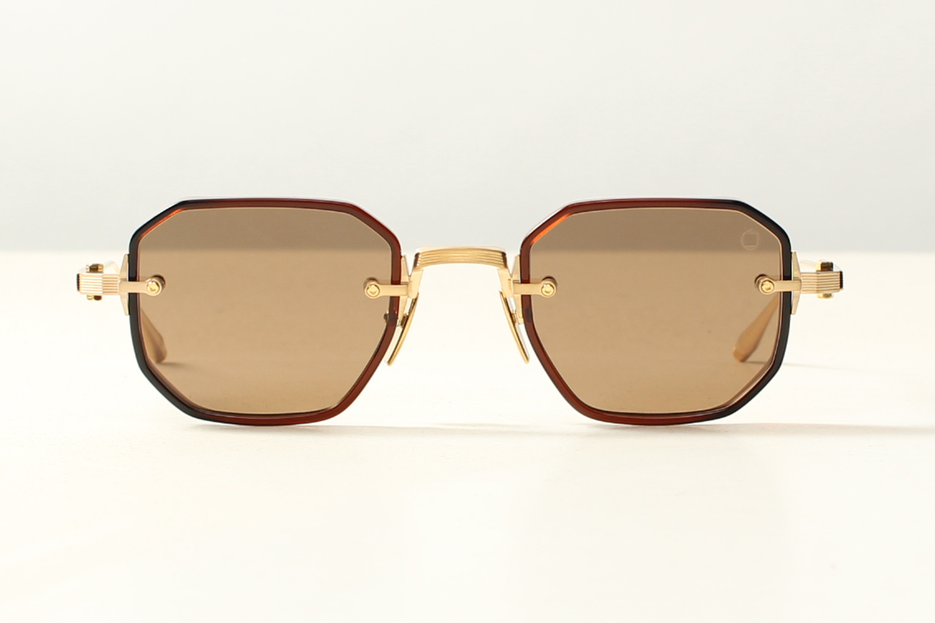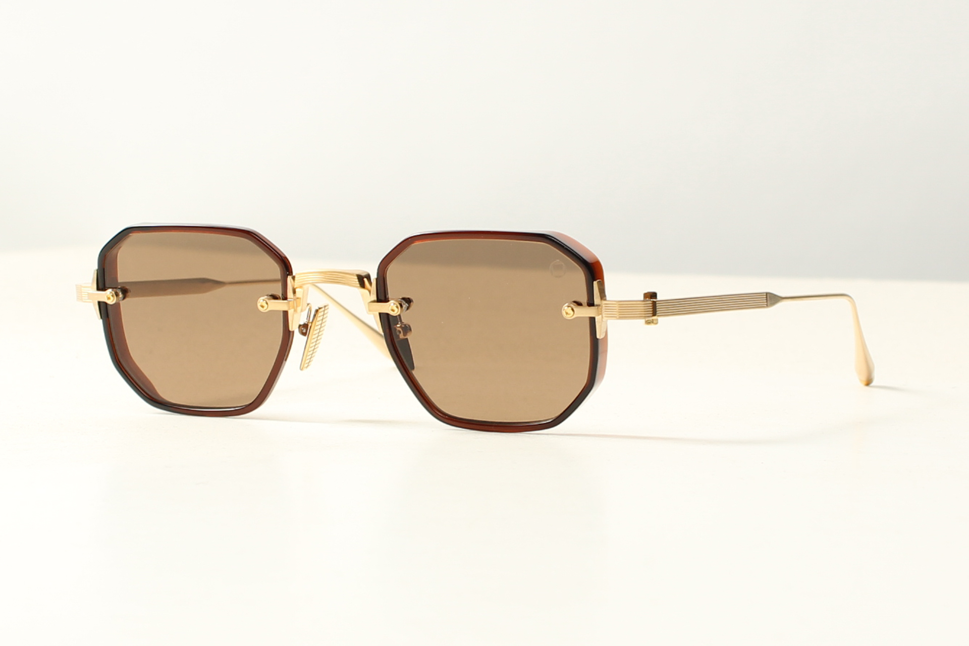 Zeer fraaie zonnebril vintage model Juno Two Gedetailleerd montuur met bruin acetaat glasranden en mat double titanium veren en neusbrug. Bruine glazen.