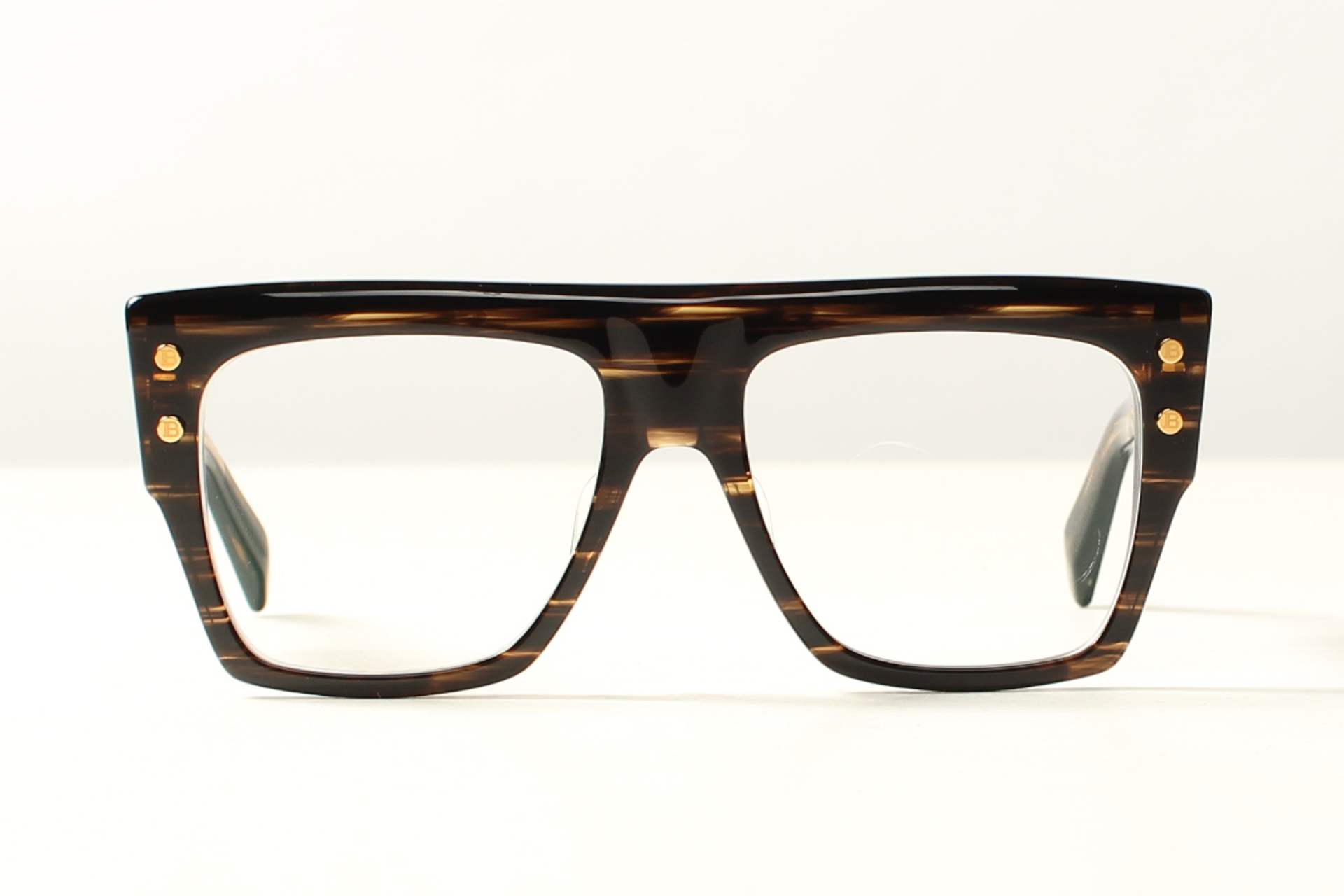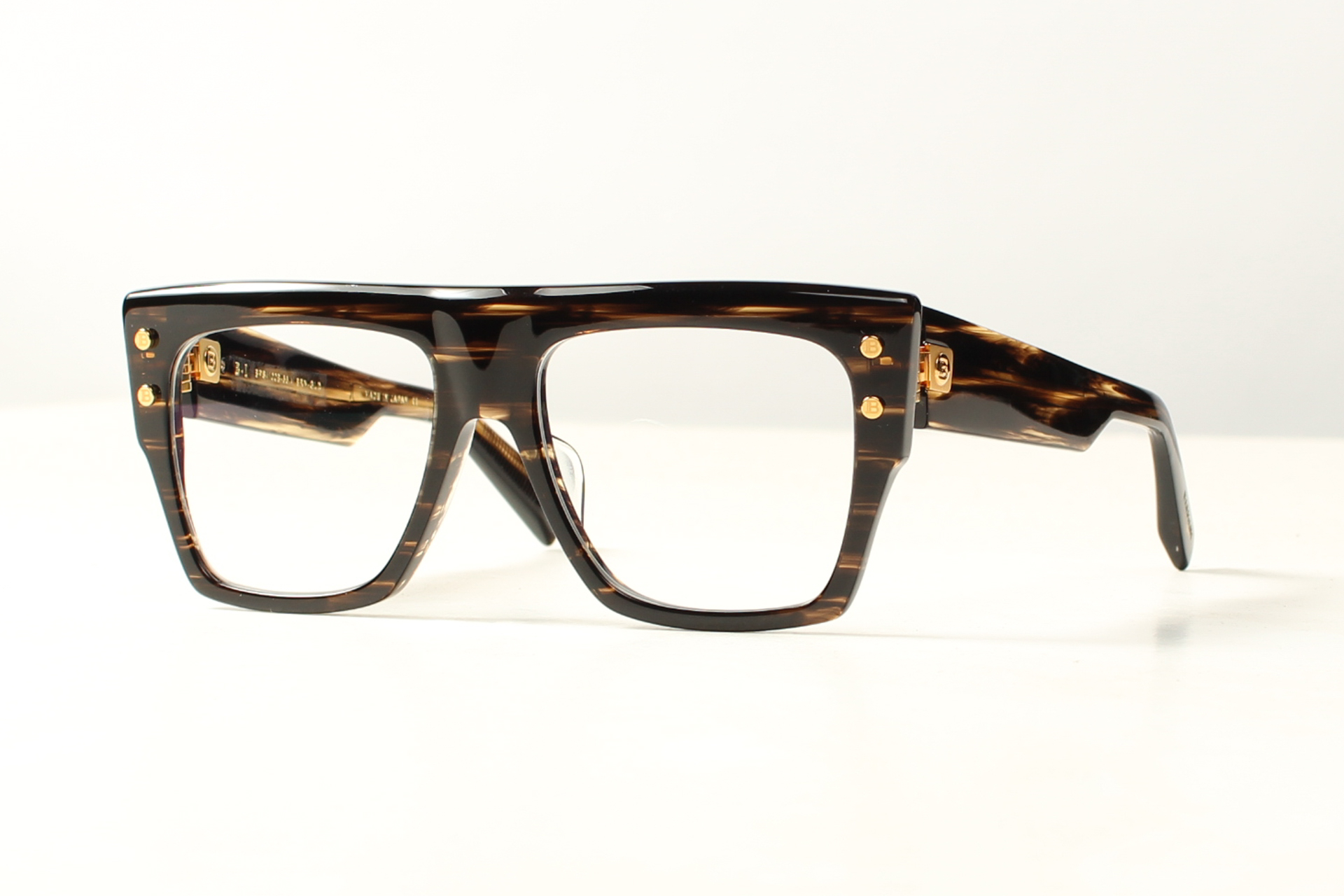 Klassiek model van Balmain in gestreept bruin japans acetaat met goudkleurige details.