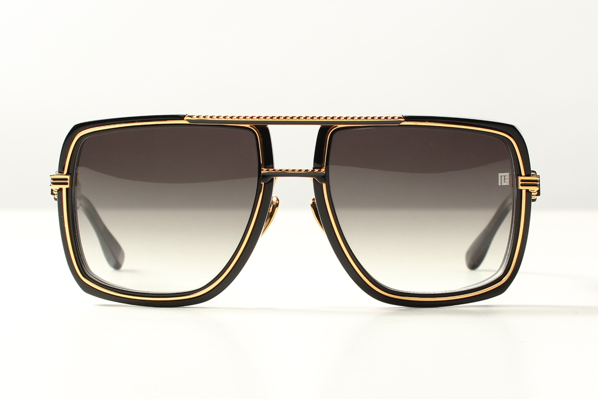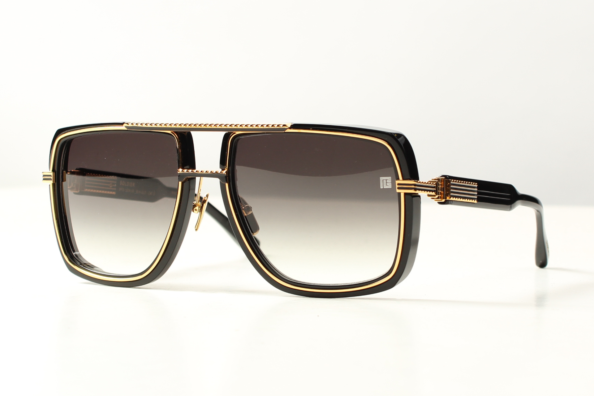 Balmain zonnebril in combinatie van zwart acetaat met goud doublé frame en grijs degrade glazen.