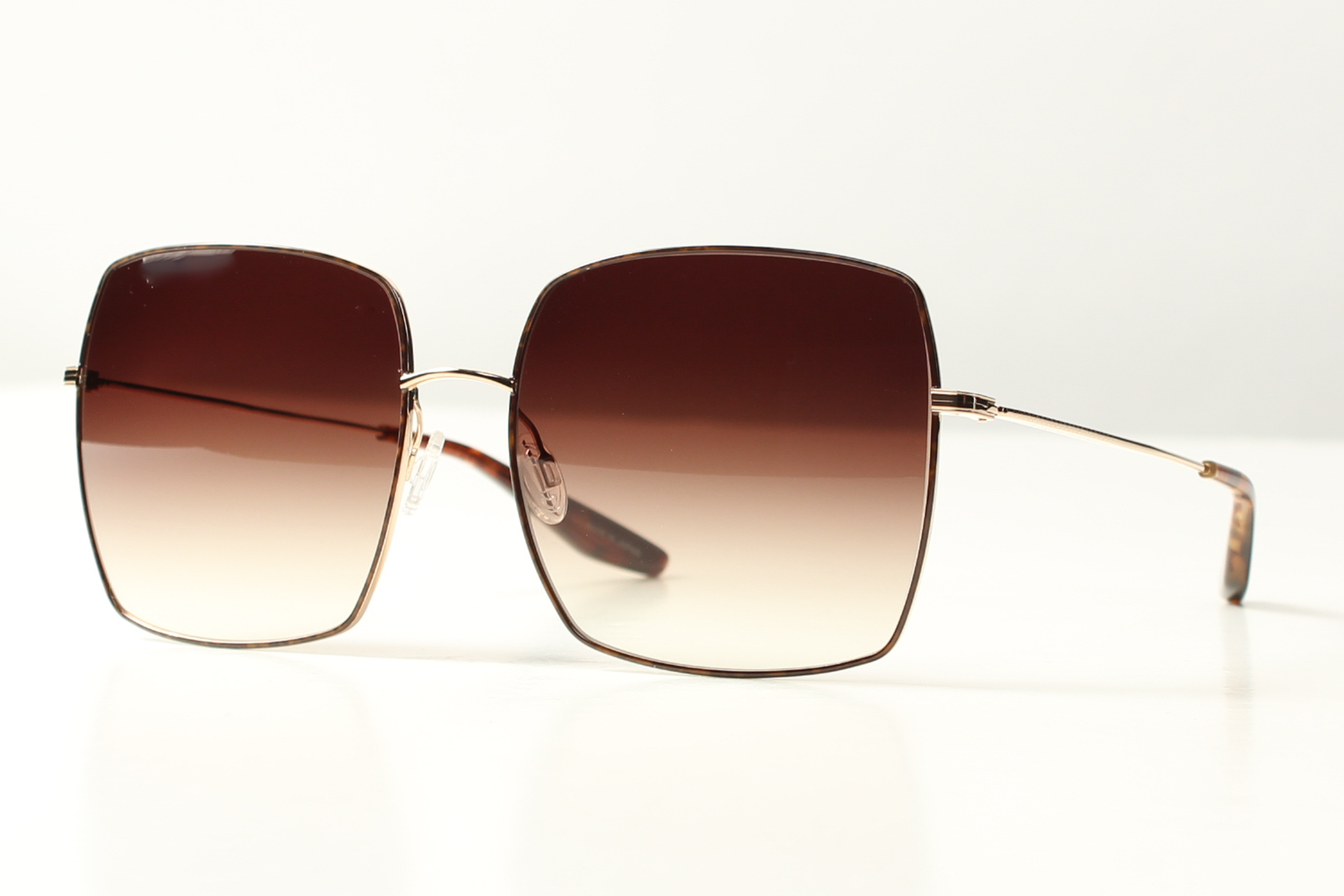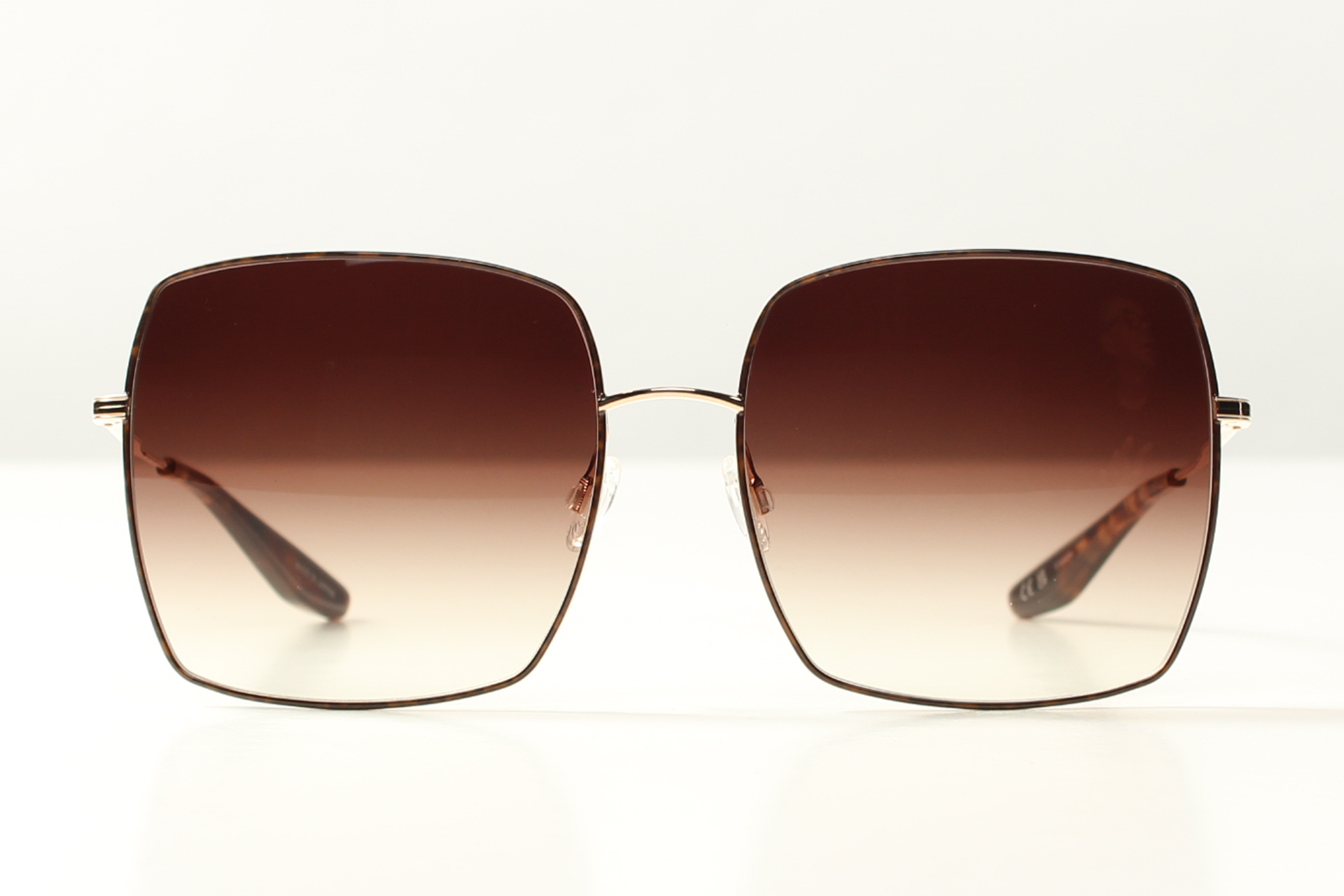 Barton Perreira, model Folasade. Vierkant model in goud double met gevlekt bruine glasrand en bruine degrade glazen.