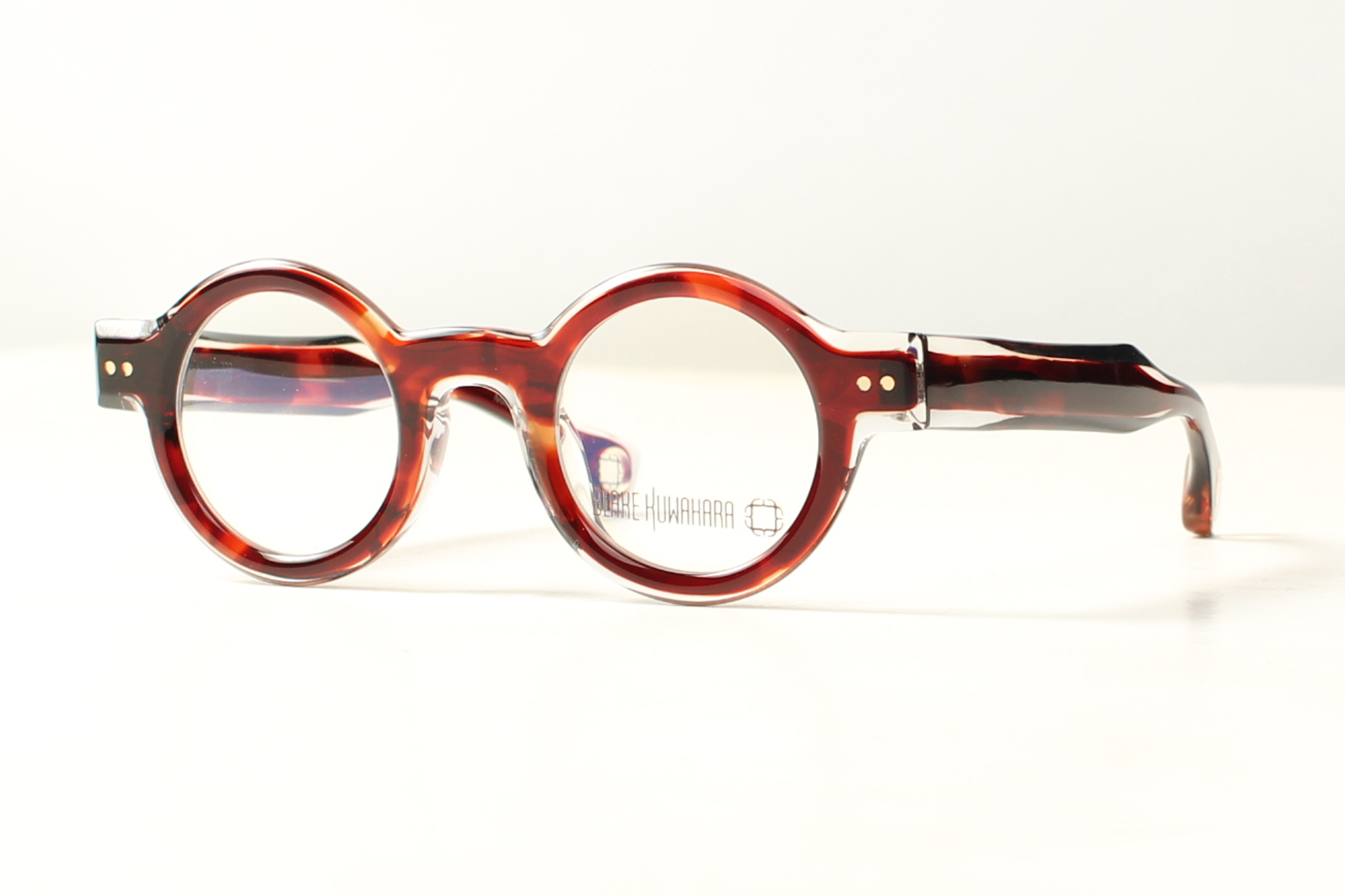 Montuur van Blake Kuwahara. Rond model in een mooie combinatie van bruin gevlamd acetaat met een transparante rand.