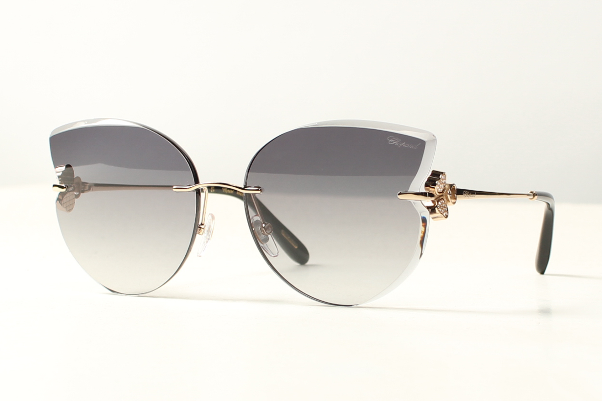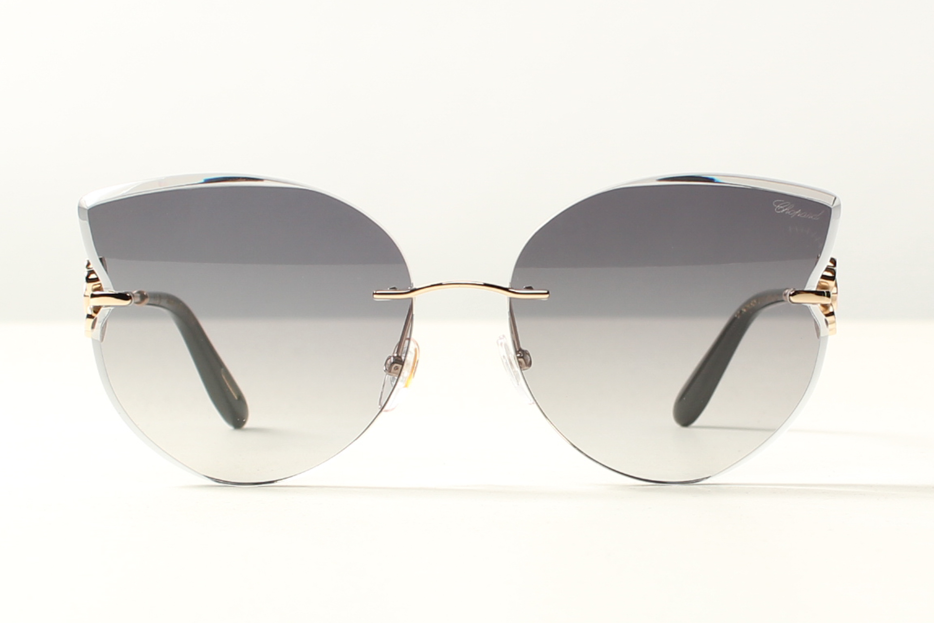 Chopard zonnebril, elegant en stijlvol met een luxueuze uitstraling. Uitgevoerd in rose goud double, Swarovski kristallen en grijs gradiënt facet geslepen glazen.