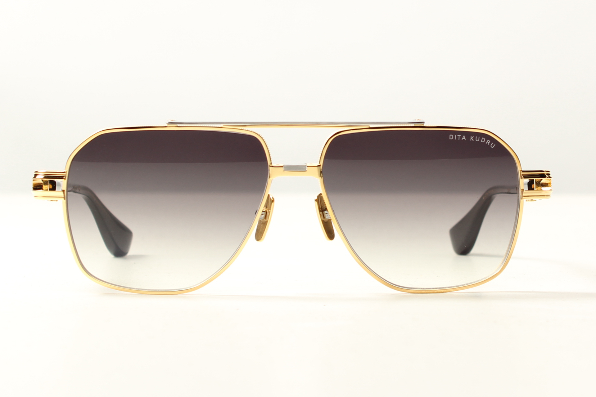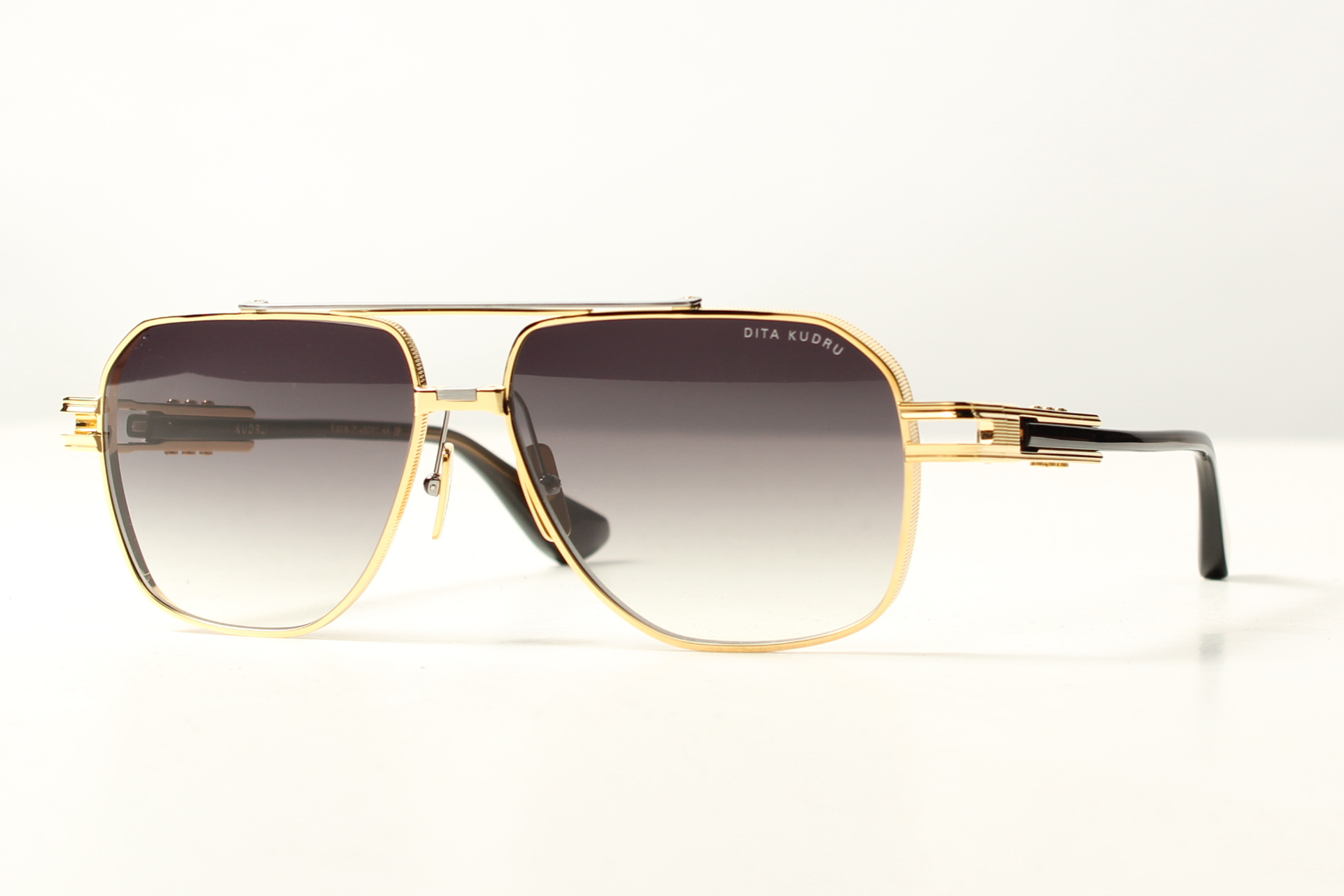 Verguld metalen Dita zonnebril met zwarte veren en grijs degrade glazen.