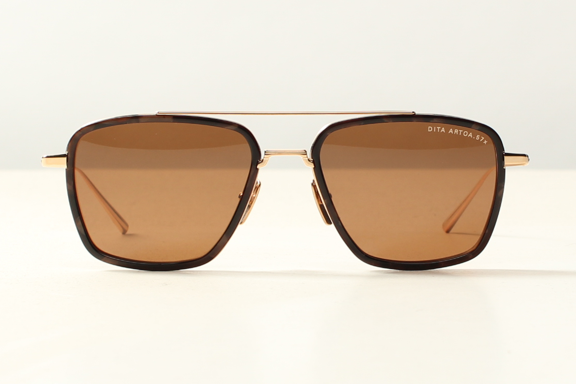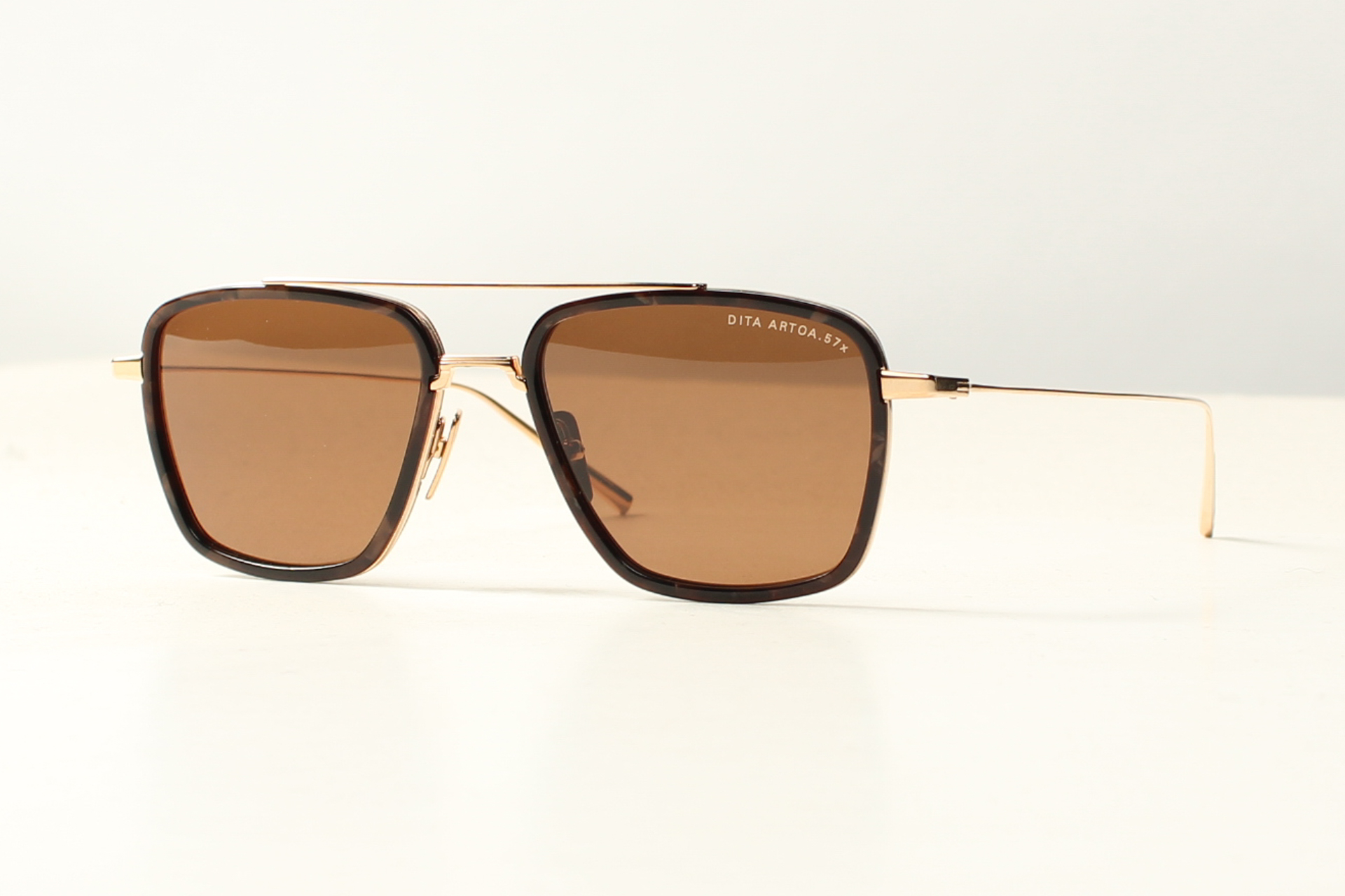 Dita Artoa.57X zonnebril in goud double titanium frame. Havanna bruin acetaat randen en bruine glazen.