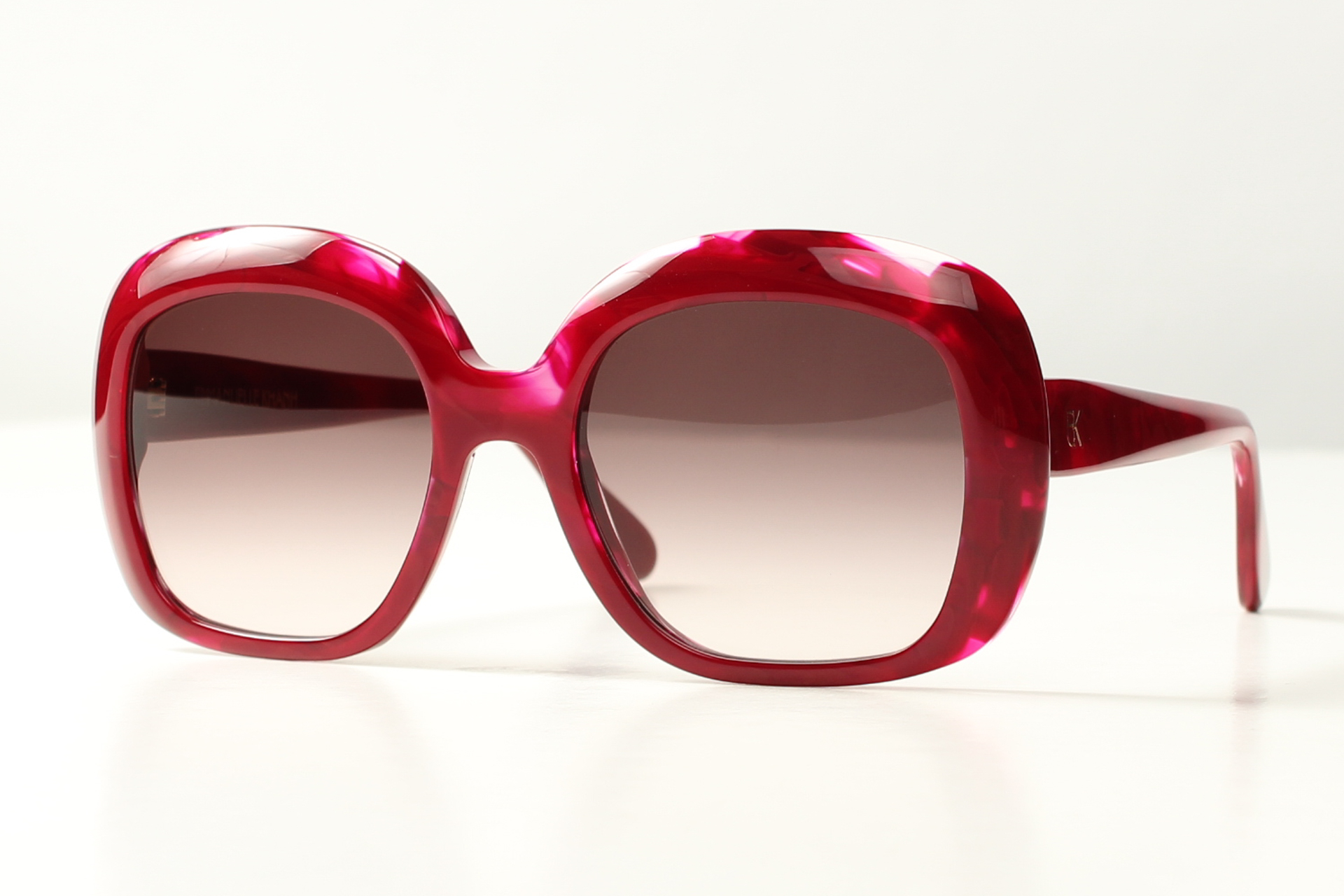 Opvallende oversized zonnebril in rood gevlekt acetaat van Emmanuelle Khanh.