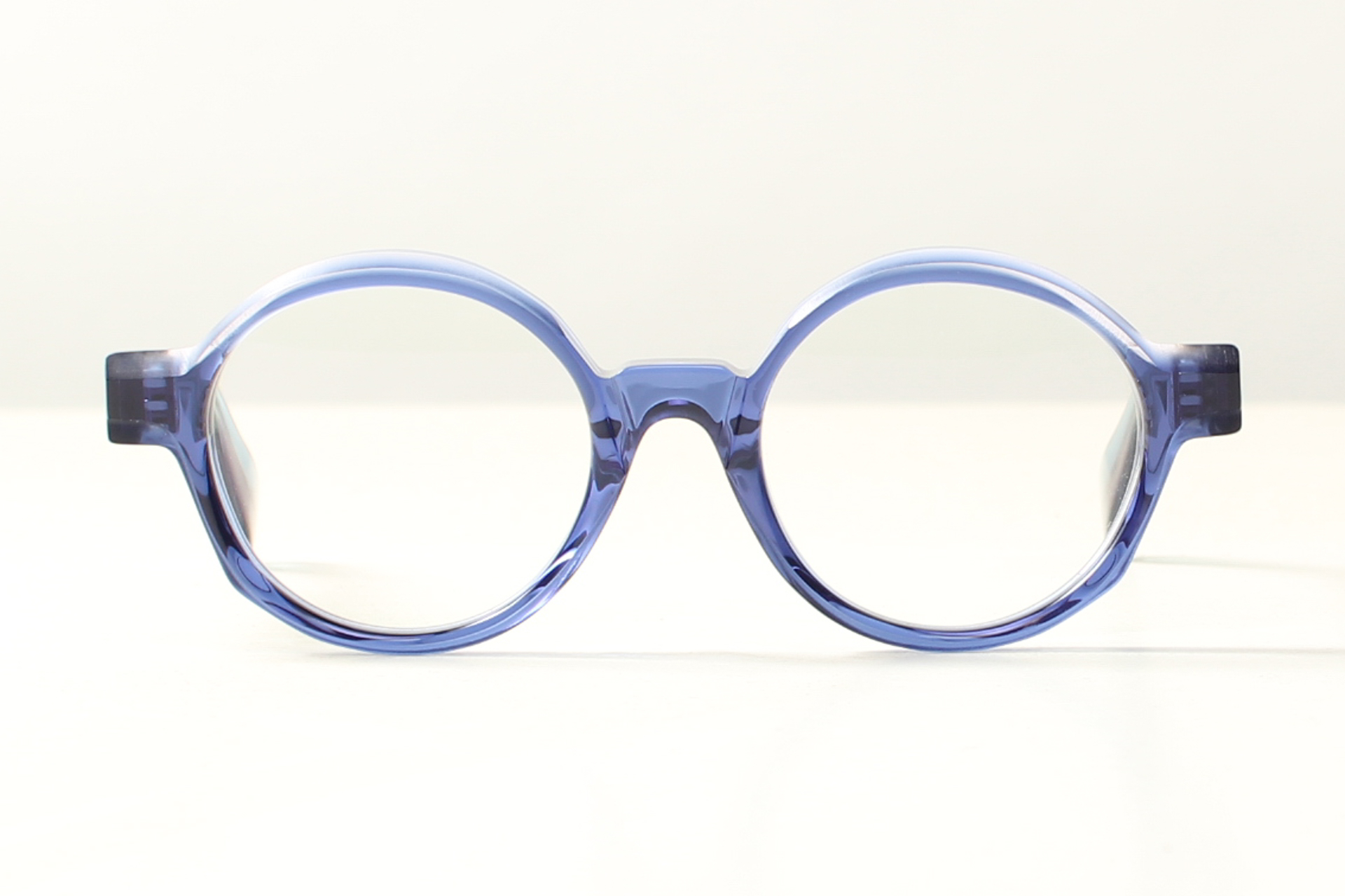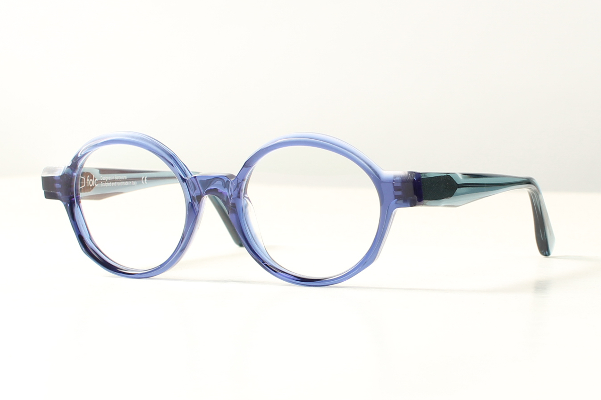 Montuur van Folc, rond model Nawi in bijzondere combinatie van de kleuren paars en blauw.