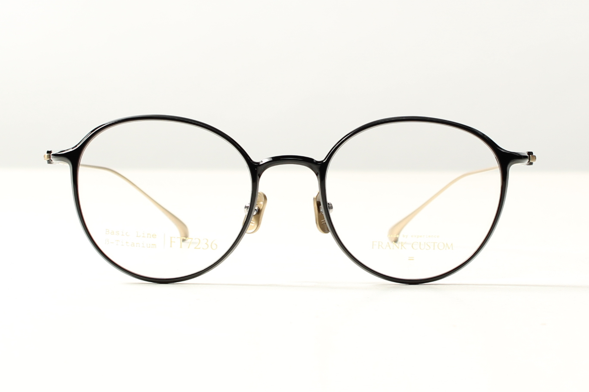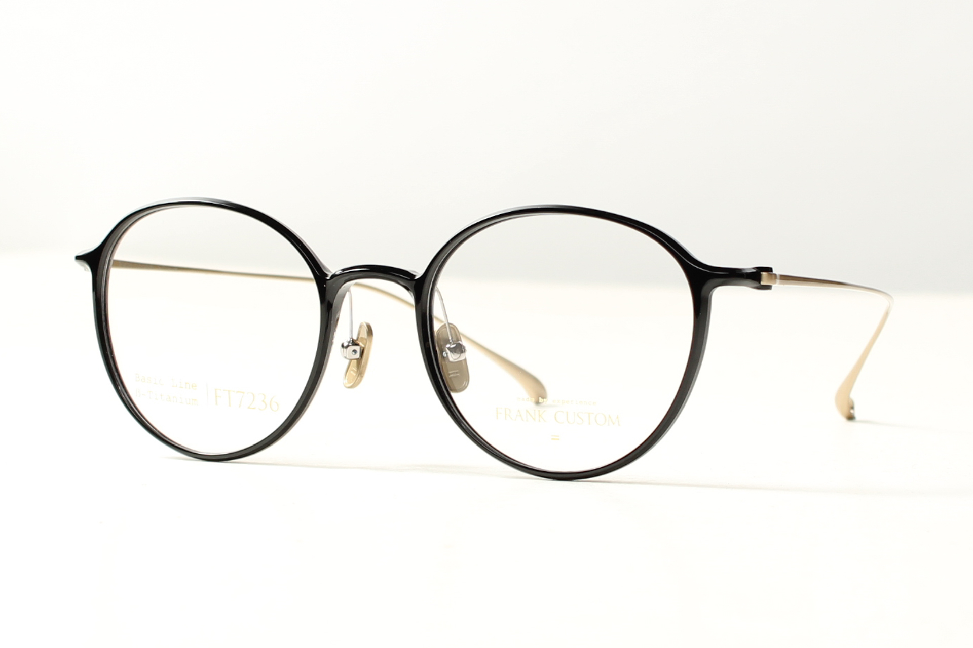 Montuur van Frank Custom, glanzend zwart, rond panto model met titanium neuspads en veren