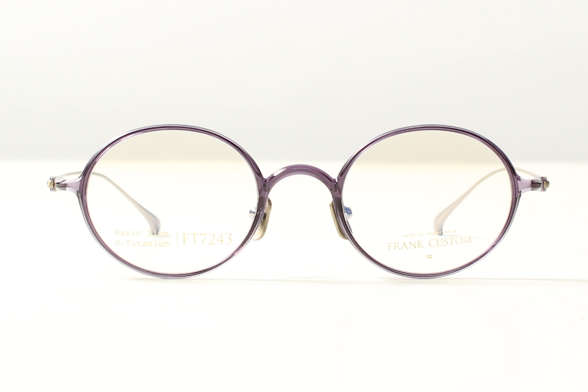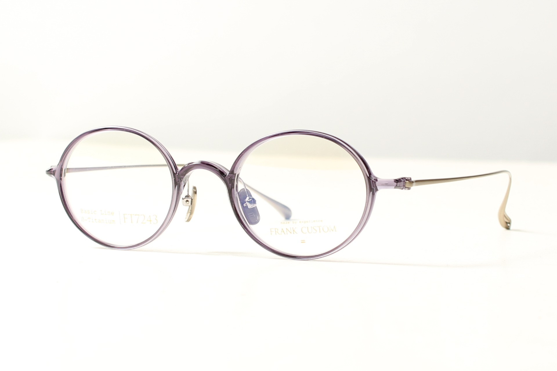 Montuur van Frank Custom, Glanzend transparant lichtpaars ovaal model met titanium neuspads en veren