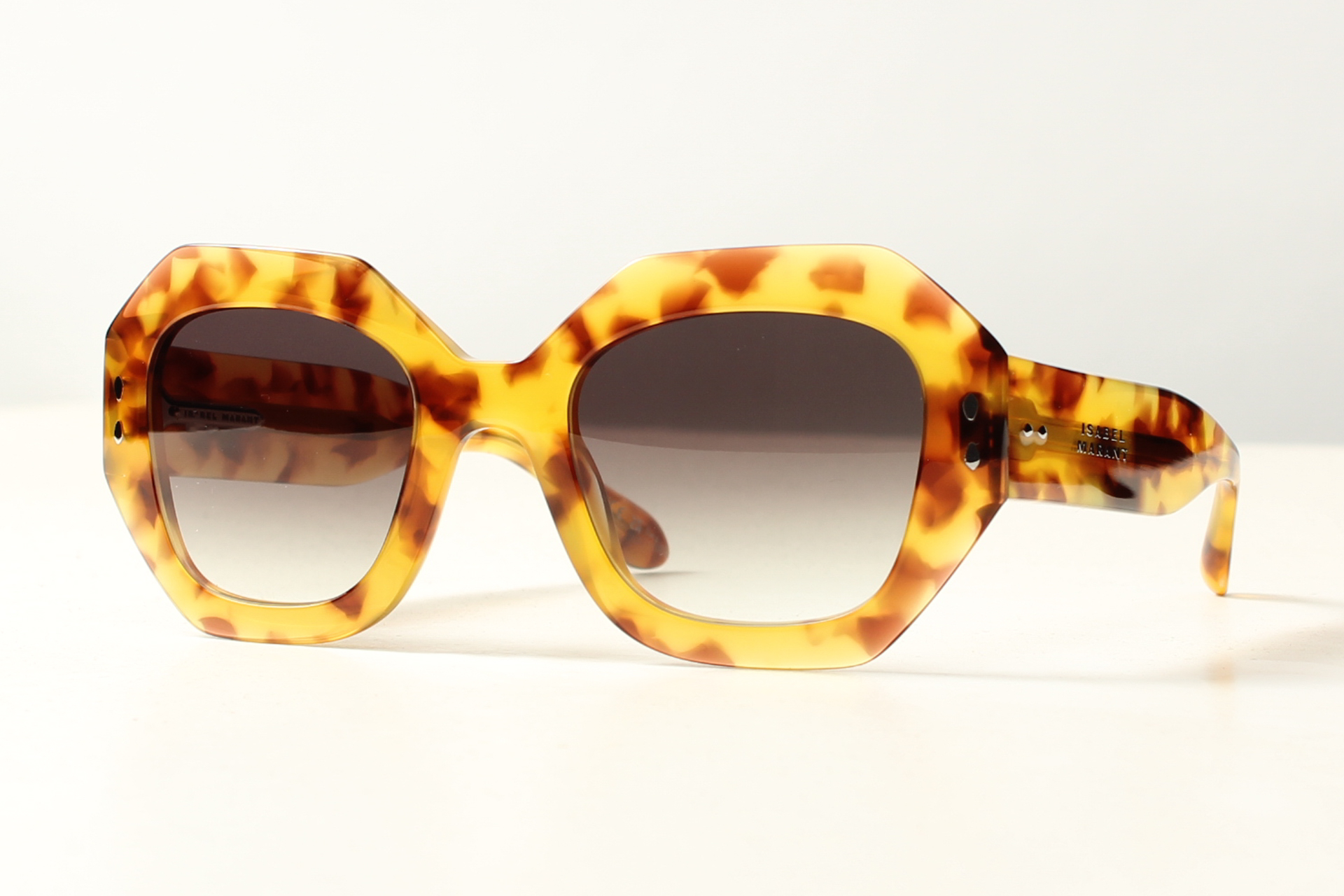 Isabel Marant zonnebril in bijzonder mooie schildpadkleur acetaat met grijs degrade glazen en Franse elegantie.