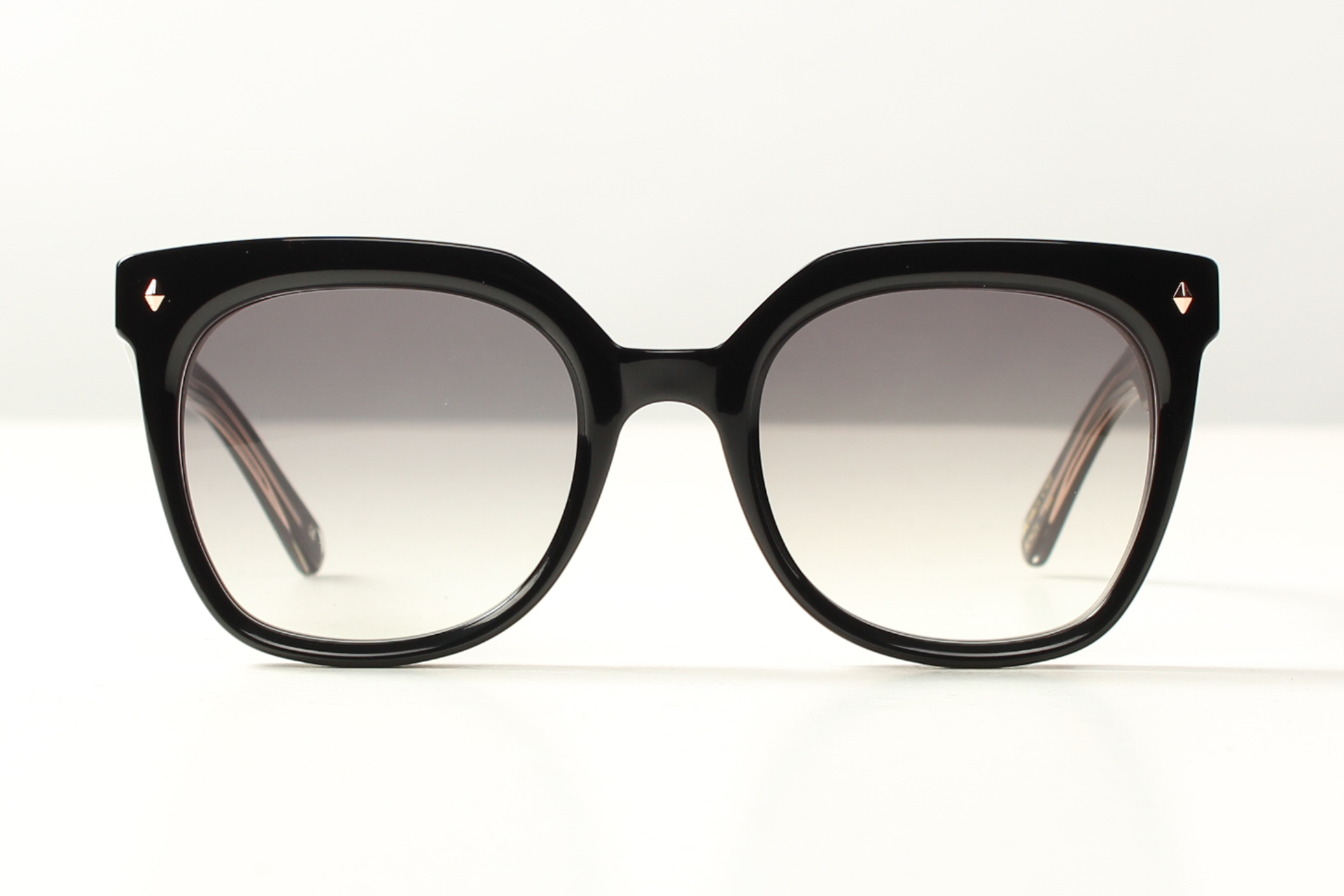 Zonnebril van John Dalia, model Monica. Uitgevoerd in hoogglanzend zwart acetaat en grijs degrade glazen.