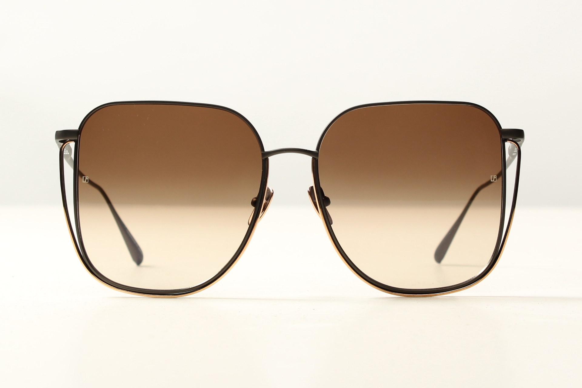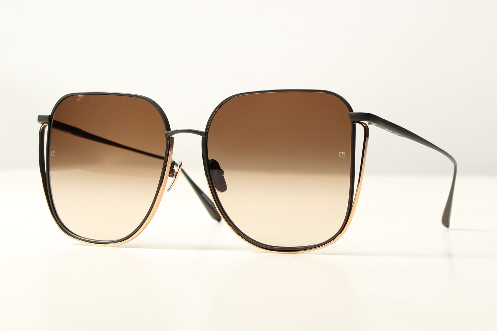 Zonnebril in mat zwart titanium en goud double rand. Bruin degrade glazen.