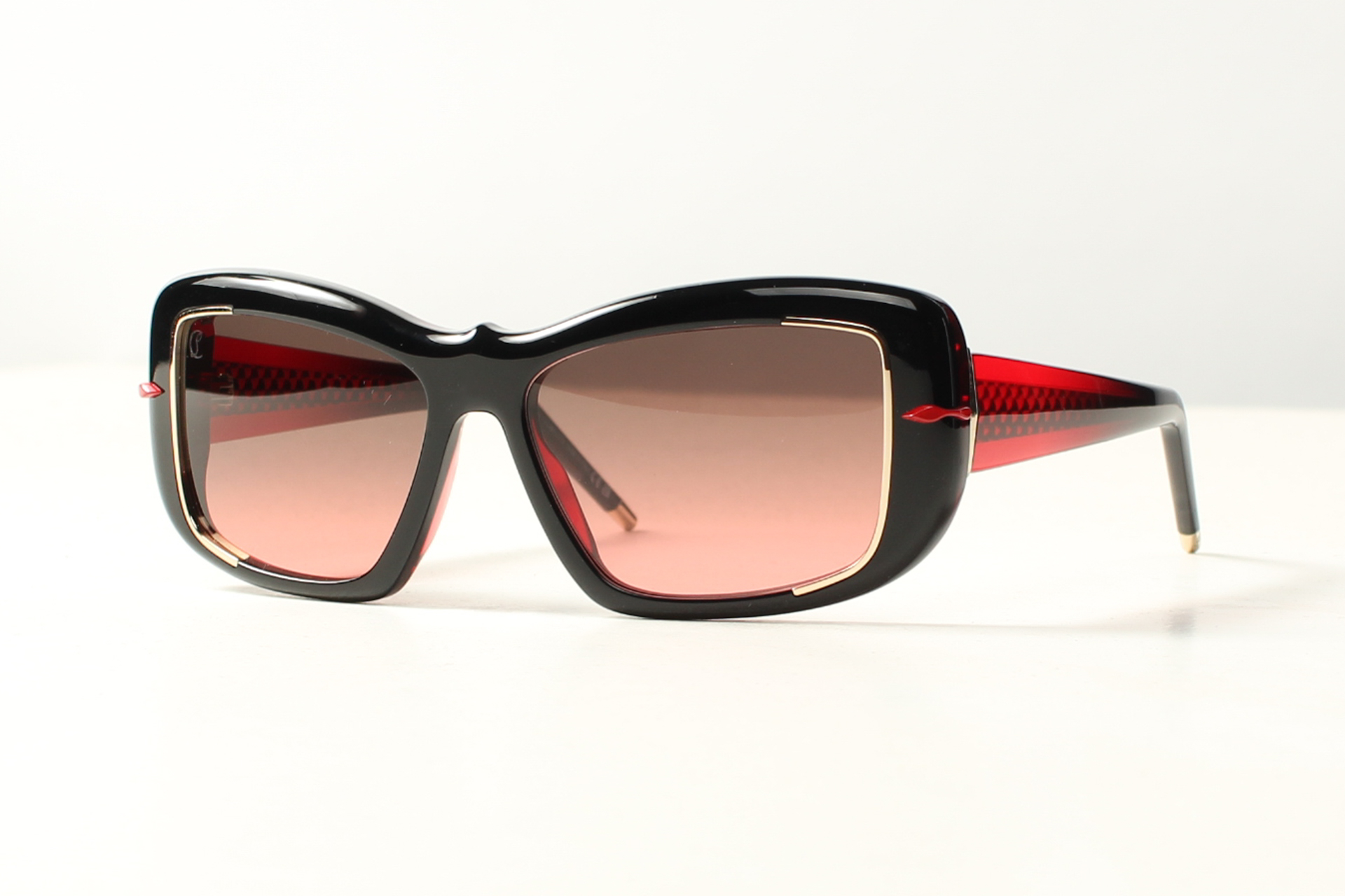 Louboutin zonnebril in een elegante vlindervorm met kenmerkend voor het modehuis, rode sierlijke details.