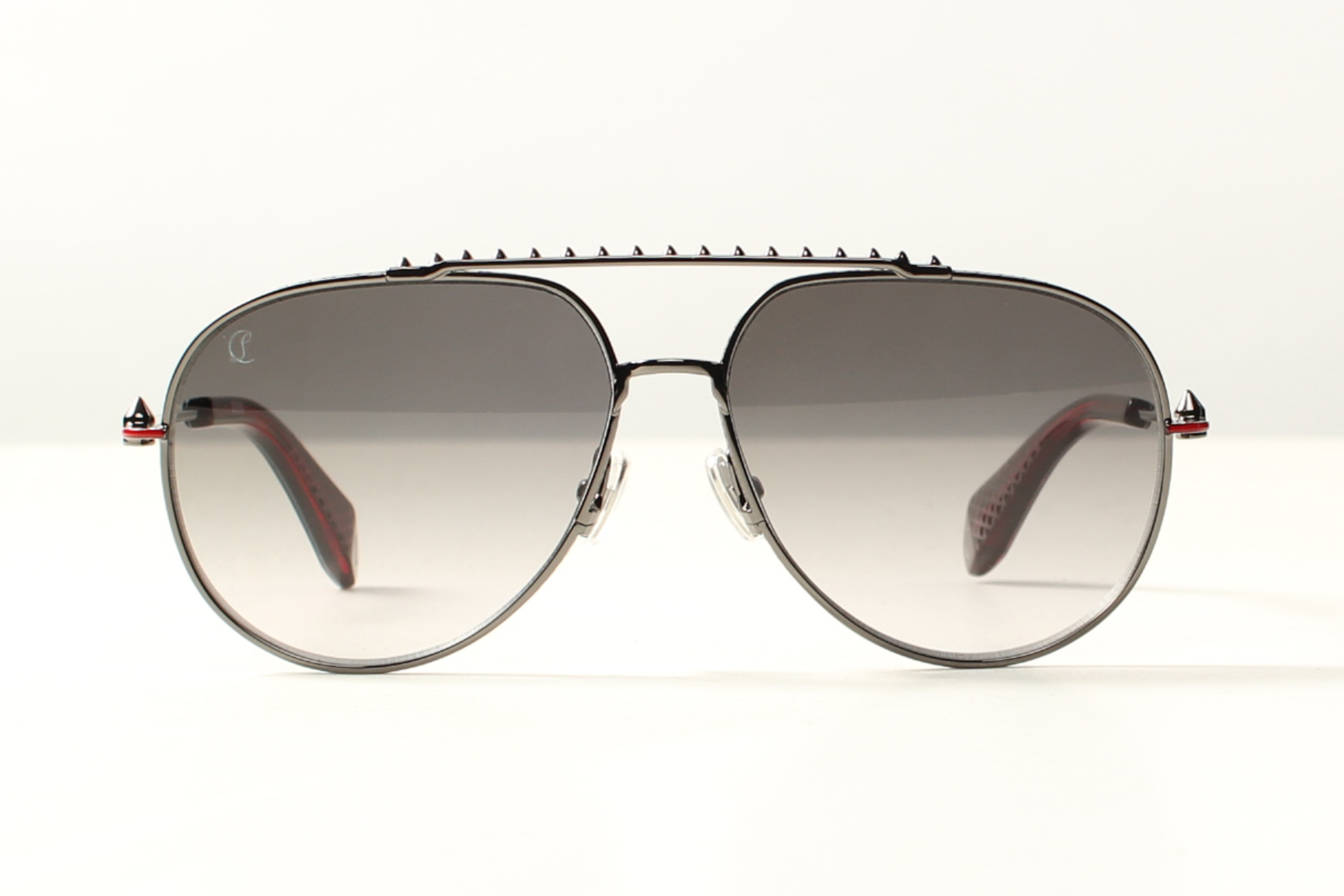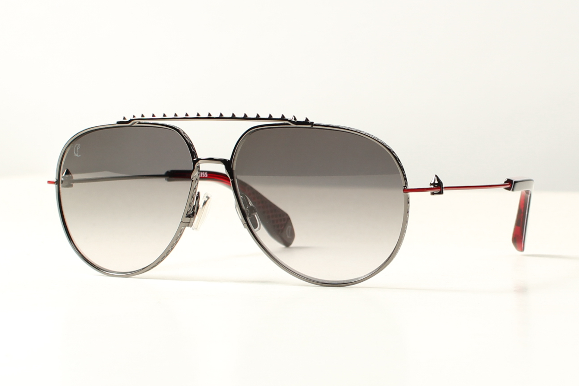 Unisex Louboutin aviator zonnebril, glanzend donker zilver montuur gecombineerd met chique rood gelakte veren, stoere details en grijs degrade glazen.