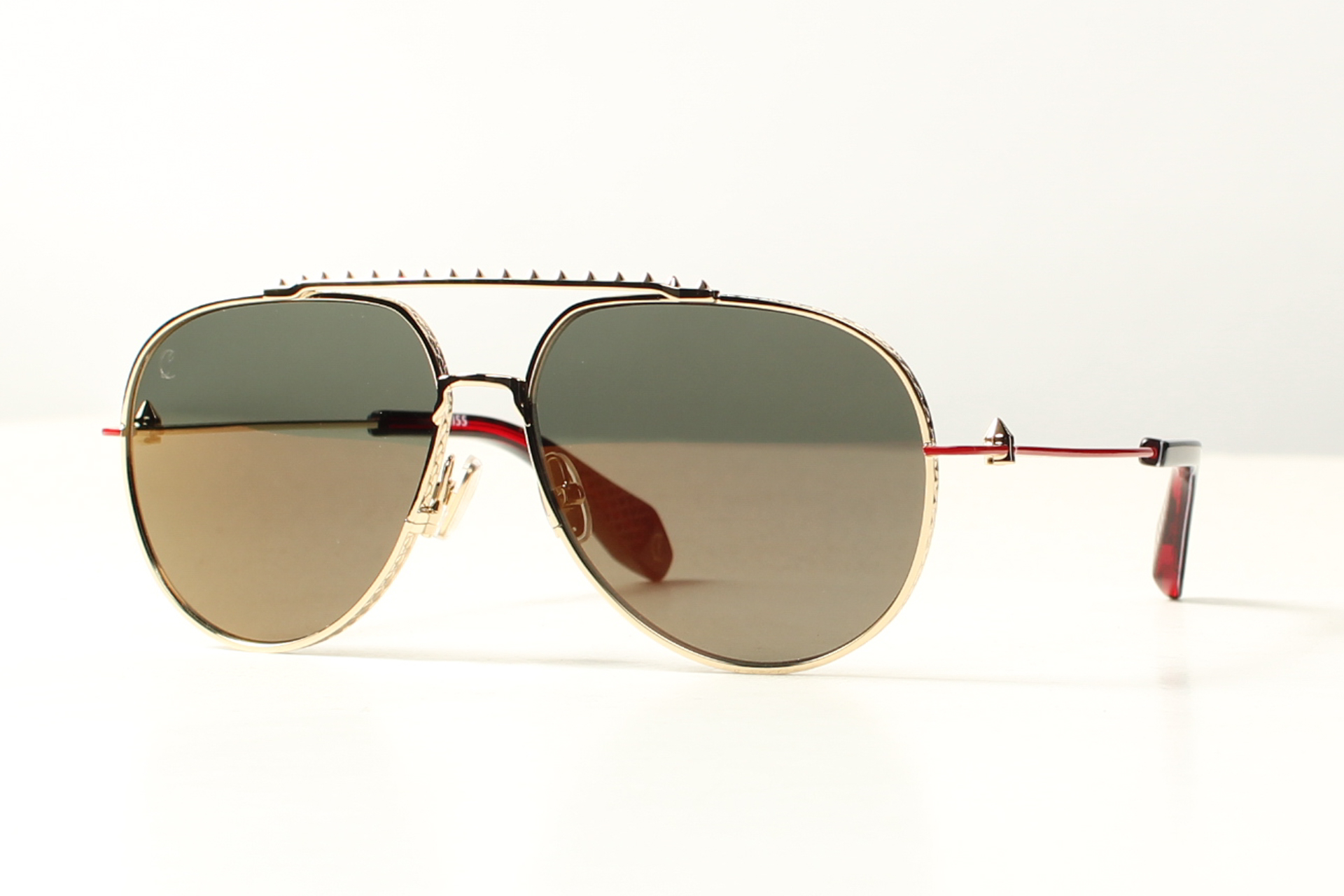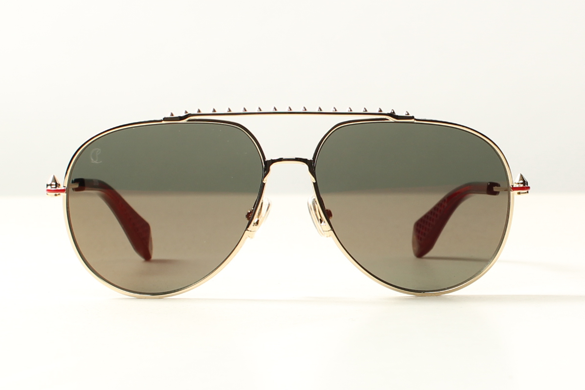 Unisex Louboutin aviator zonnebril, glanzend goud double montuur gecombineerd met chique rood gelakte veren, stoere details en bruine flash mirror glazen.
