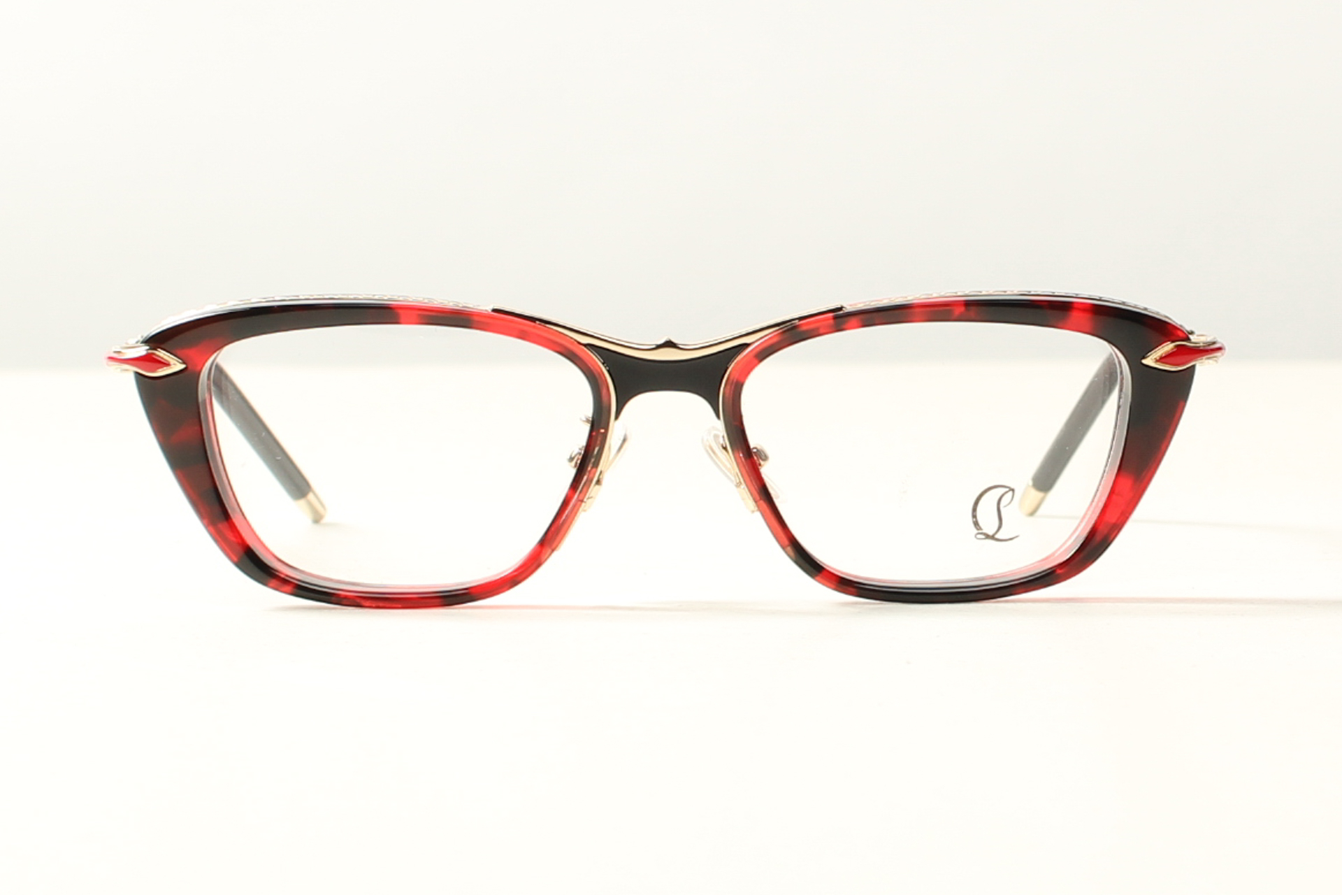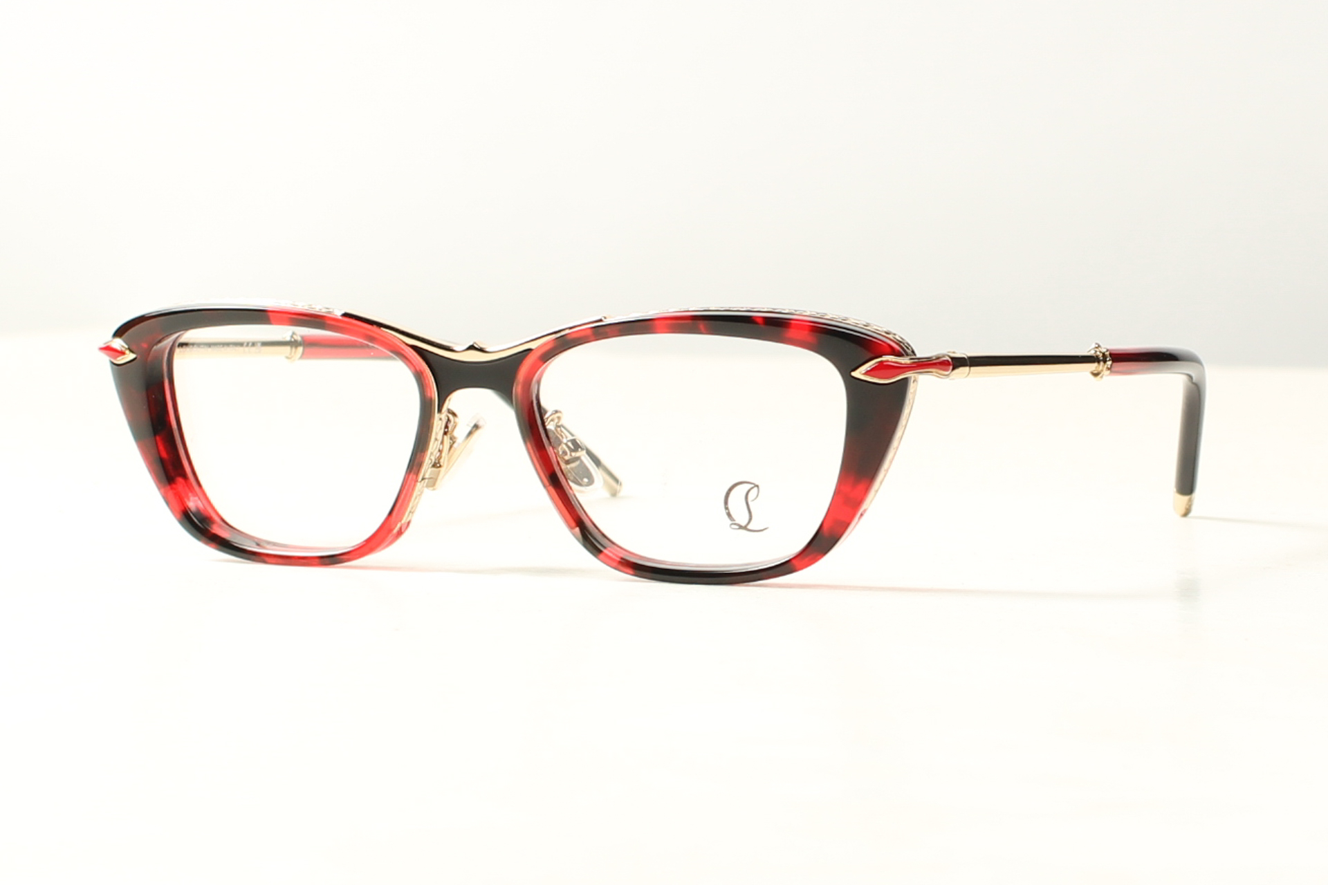 Louboutin zwart/rood acetaat gecombineerd met goud double veren en met de typische Louboutin kenmerken zoals het accent in vorm van de bekende rode zool.