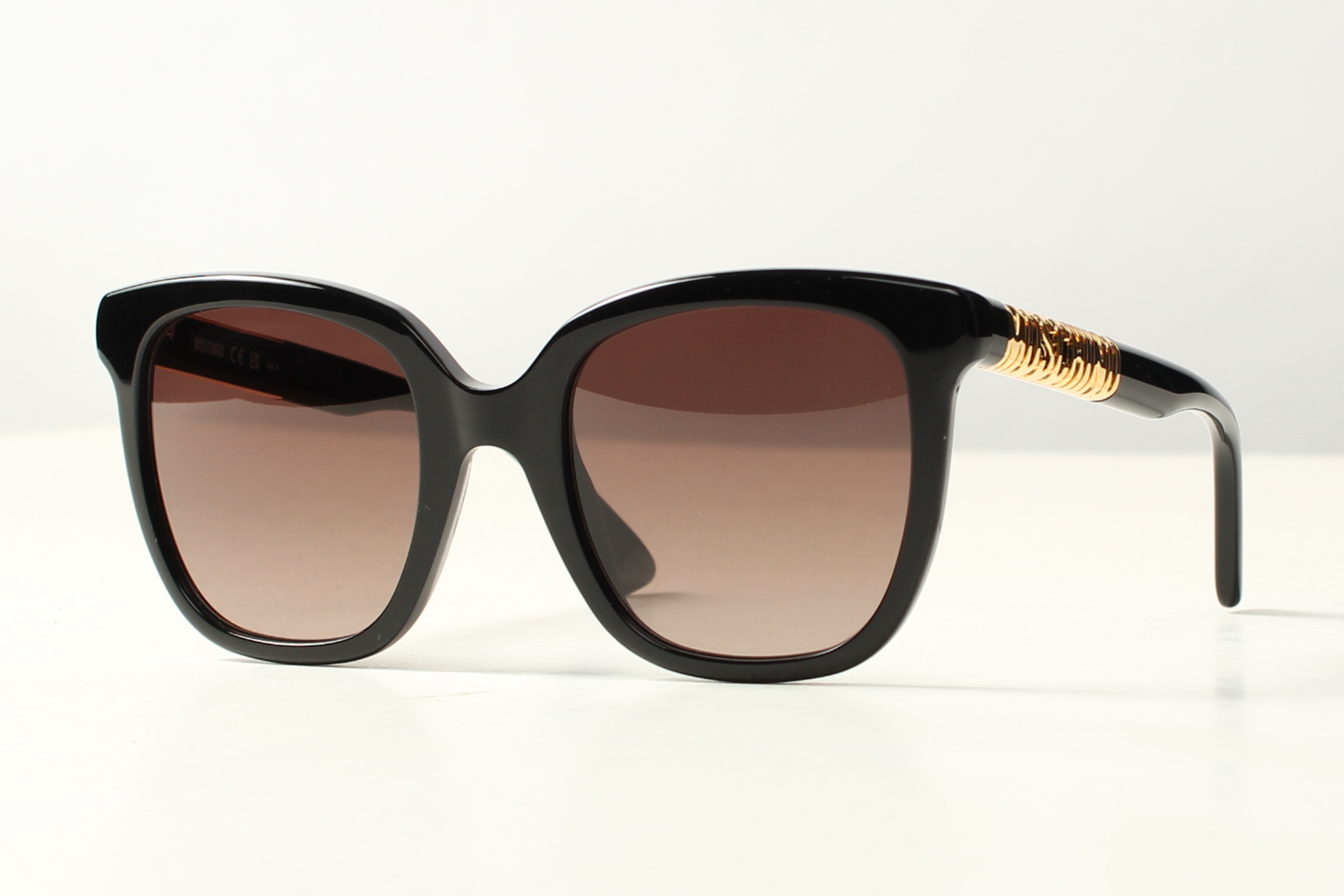 Italiaans stijlvol montuur van Moschino, zwart acetaat met in goud double het logo op de veren.