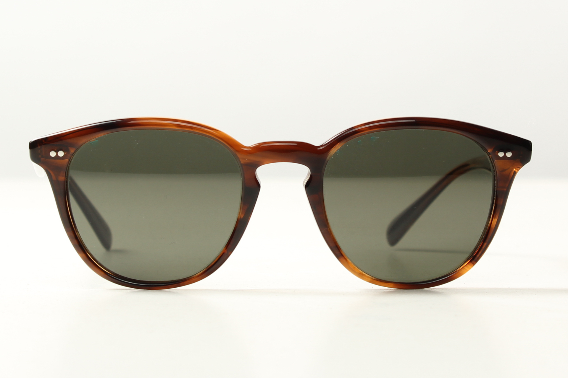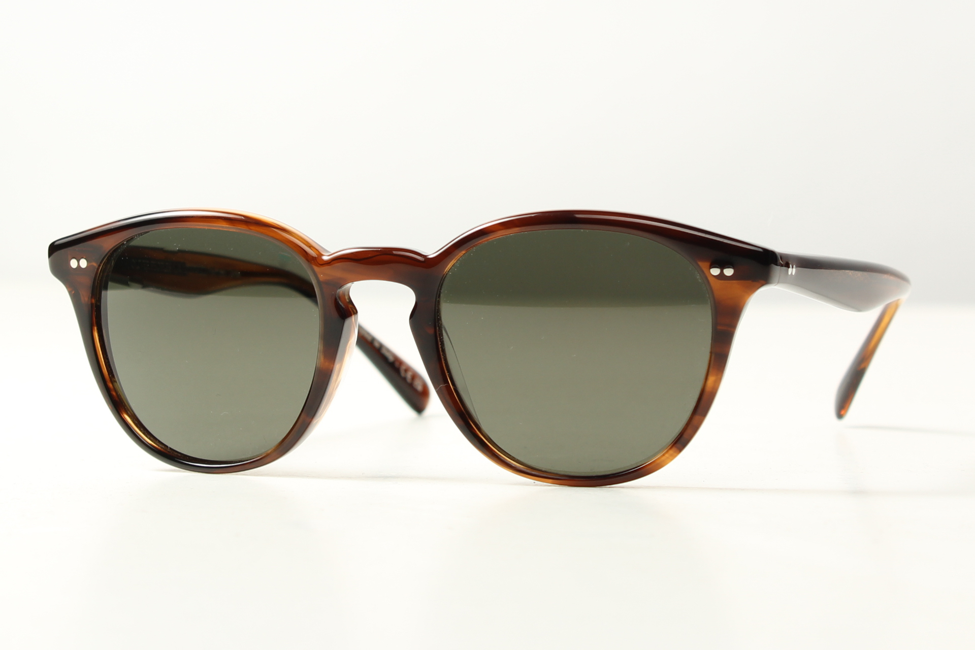 Fraaie zonnebril van Oliver Peoples model Demon Sun in dark havanna acetaat met grijs/groene glazen.