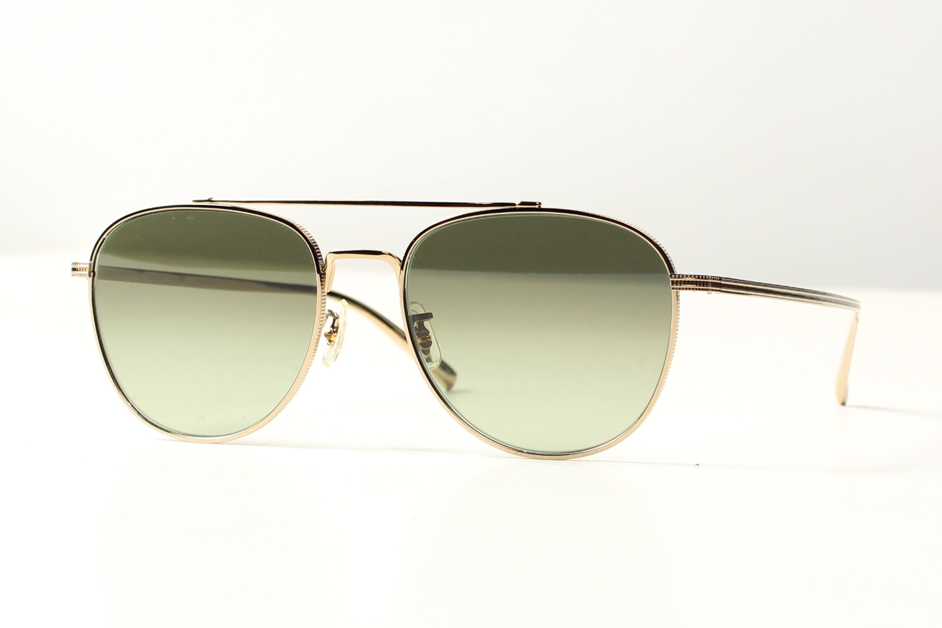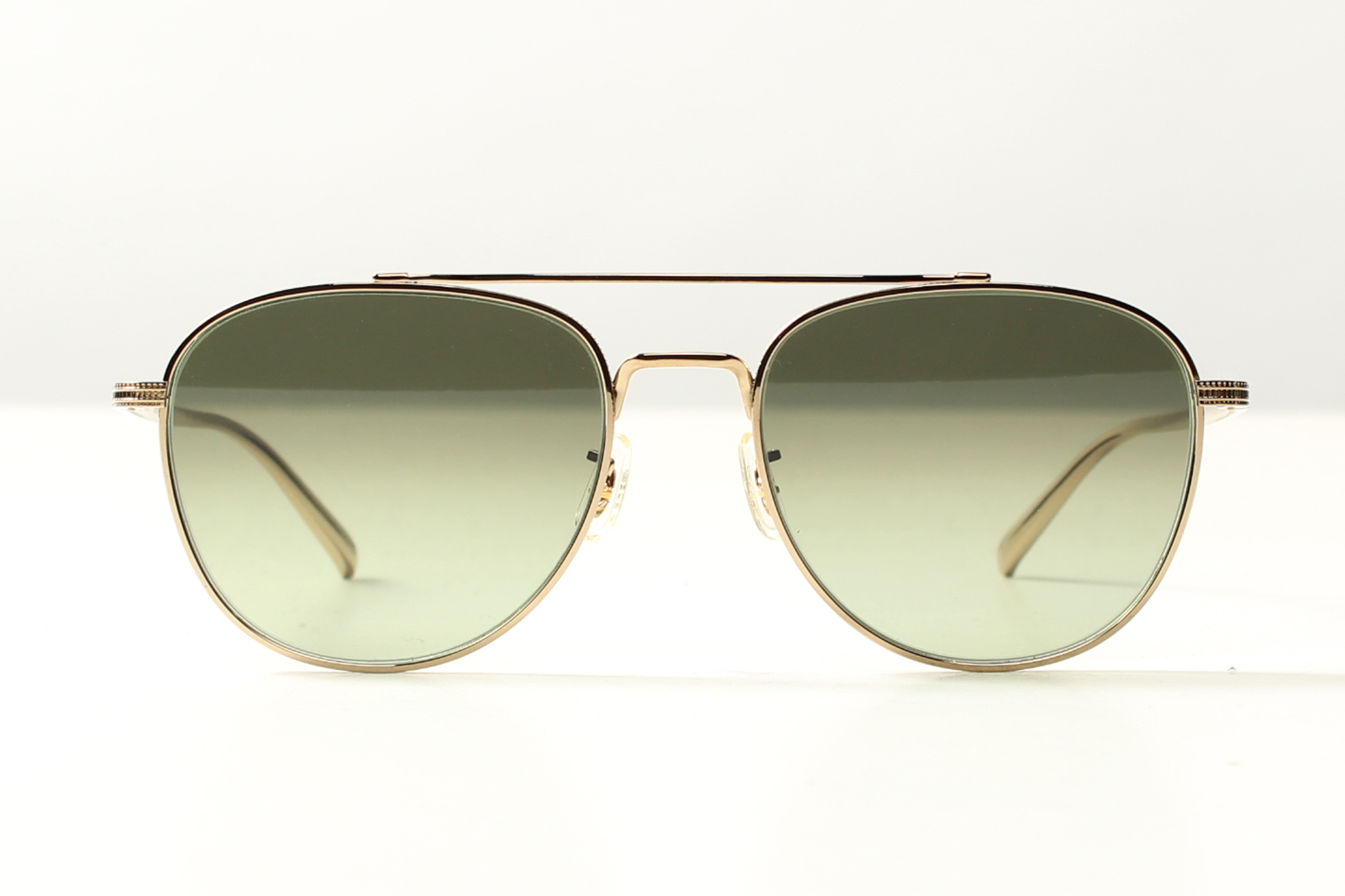 Oliver Peoples model Rivetti zonnebril in klassieke aviator vorm met groene glazen.