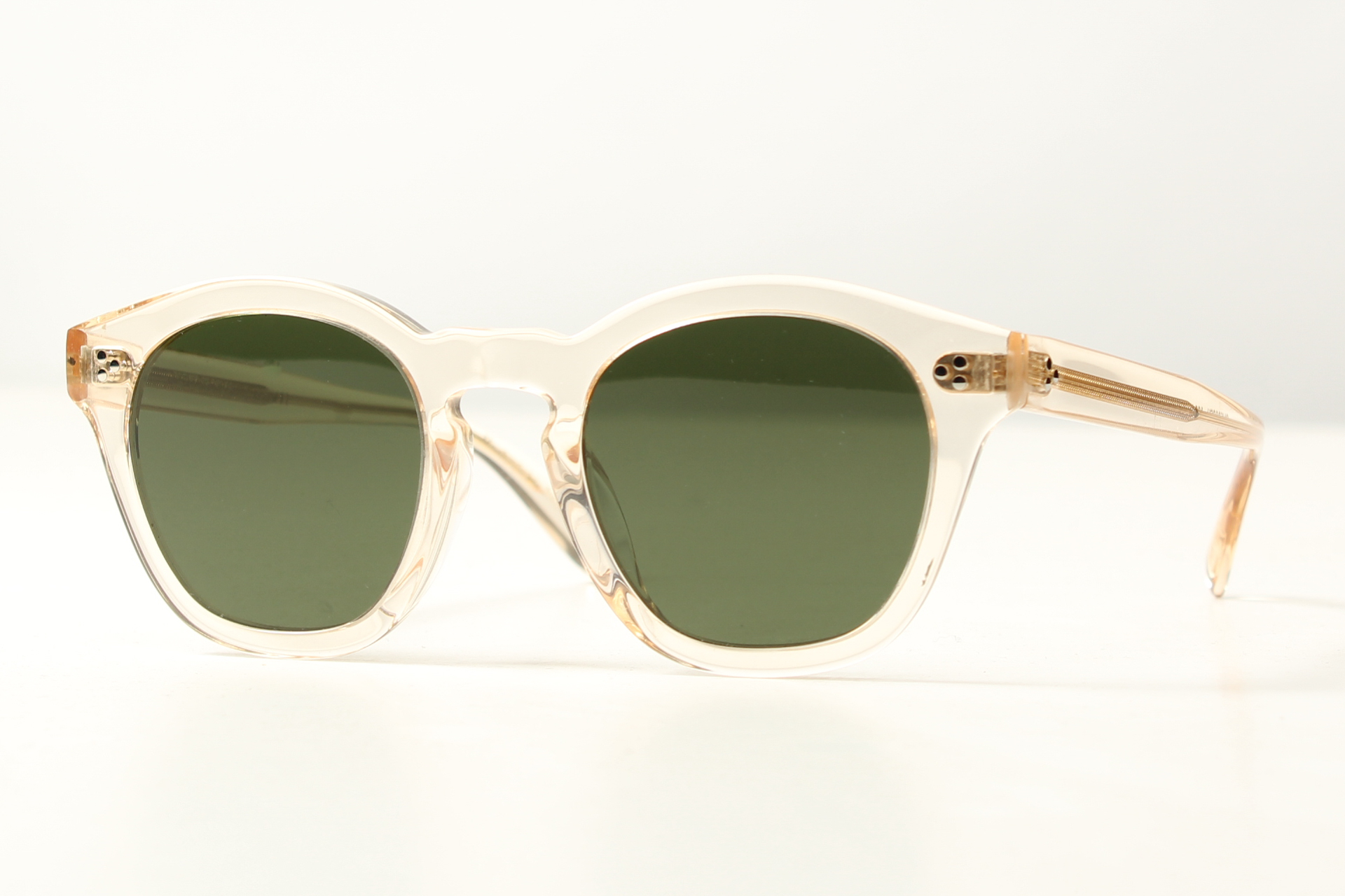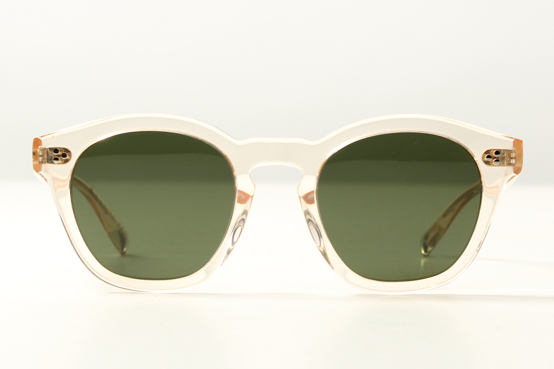 Fraaie zonnebril van Oliver Peoples model Boudreau L.A. in transparant rose acetaat met grijs/ groene glazen.