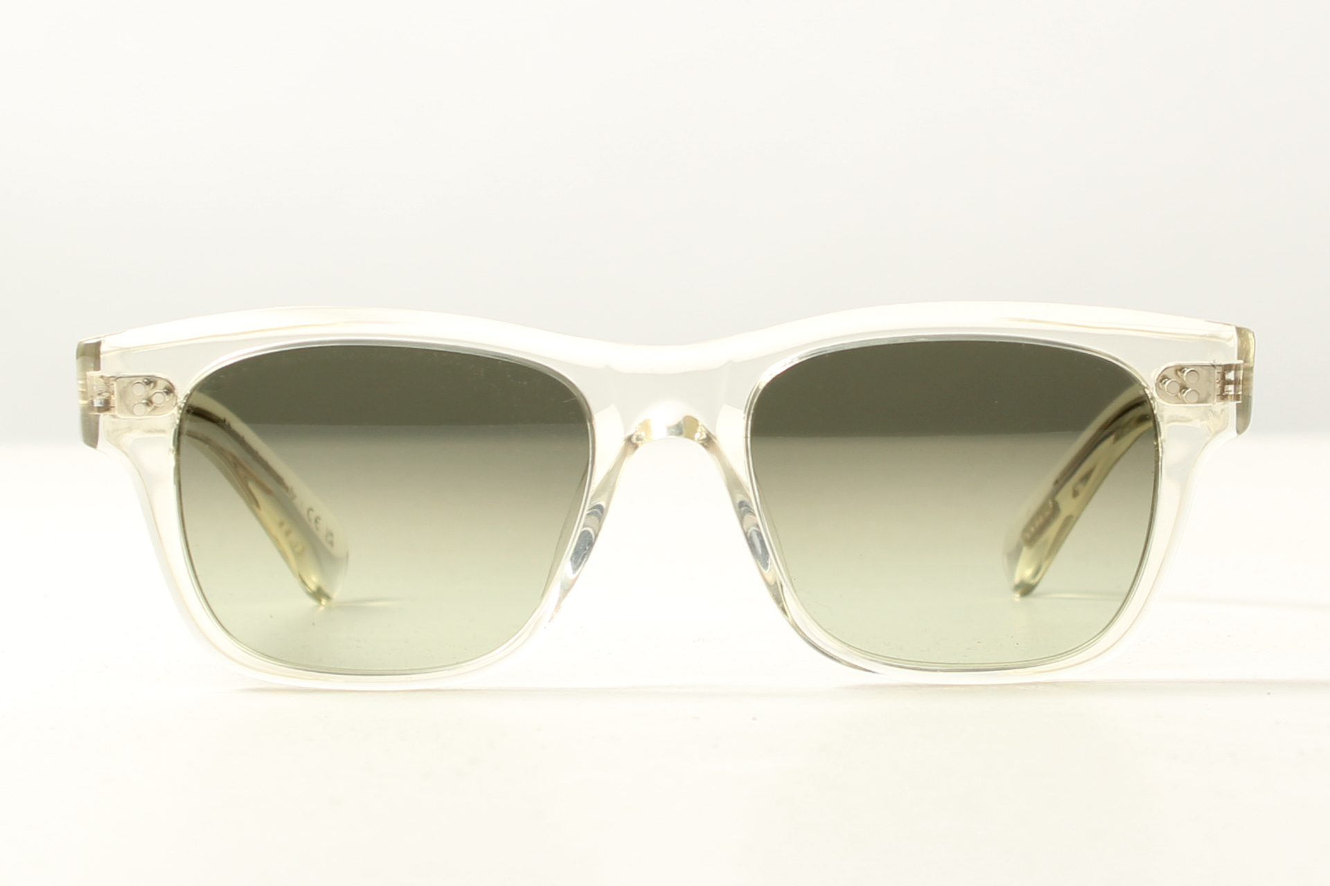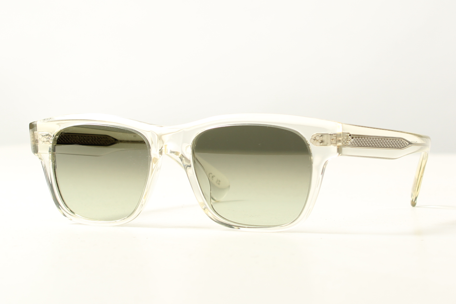 Vintage recht model zonnebril is transparant acetaat met groen degrade glazen.