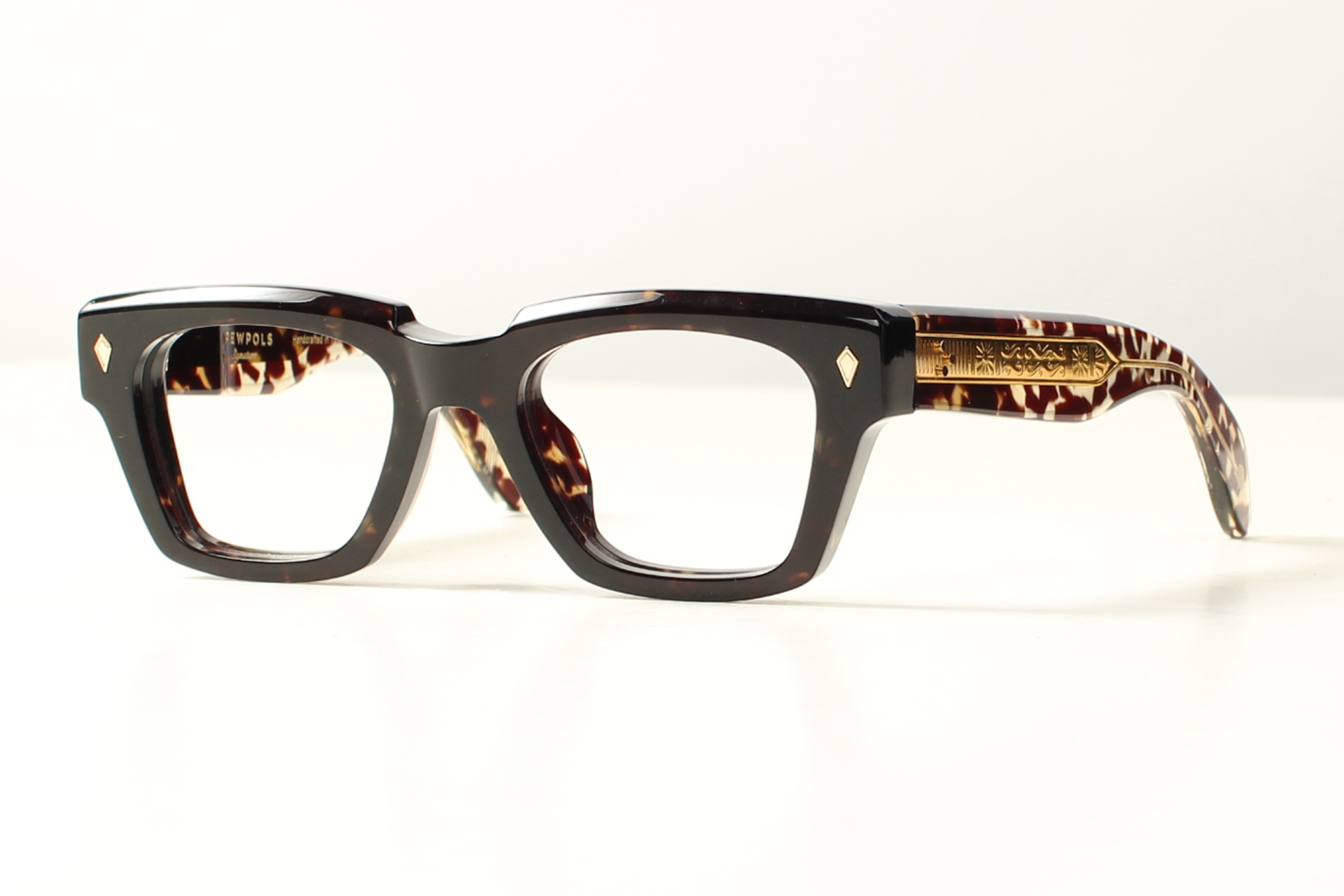 Het acetaat is gelamineerd donker havanna als kleur aan de voorkant en de achterkant plus veren van gevlekt bruin acetaat. Handgemaakt en hoogglanzend gepolijst. Dit is ambachtelijk vakmanschap uit Italie.
