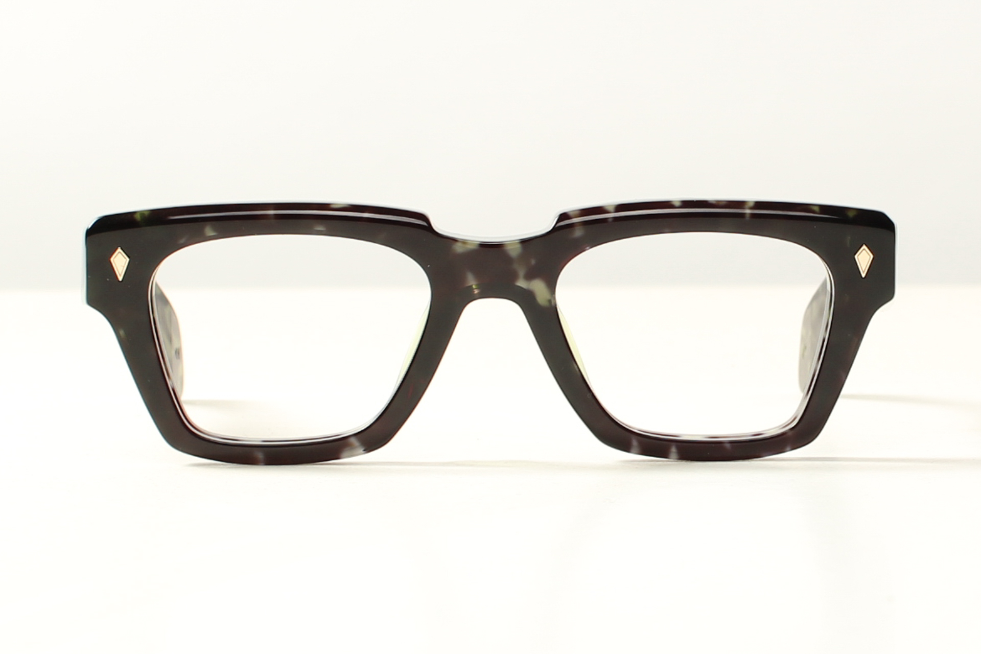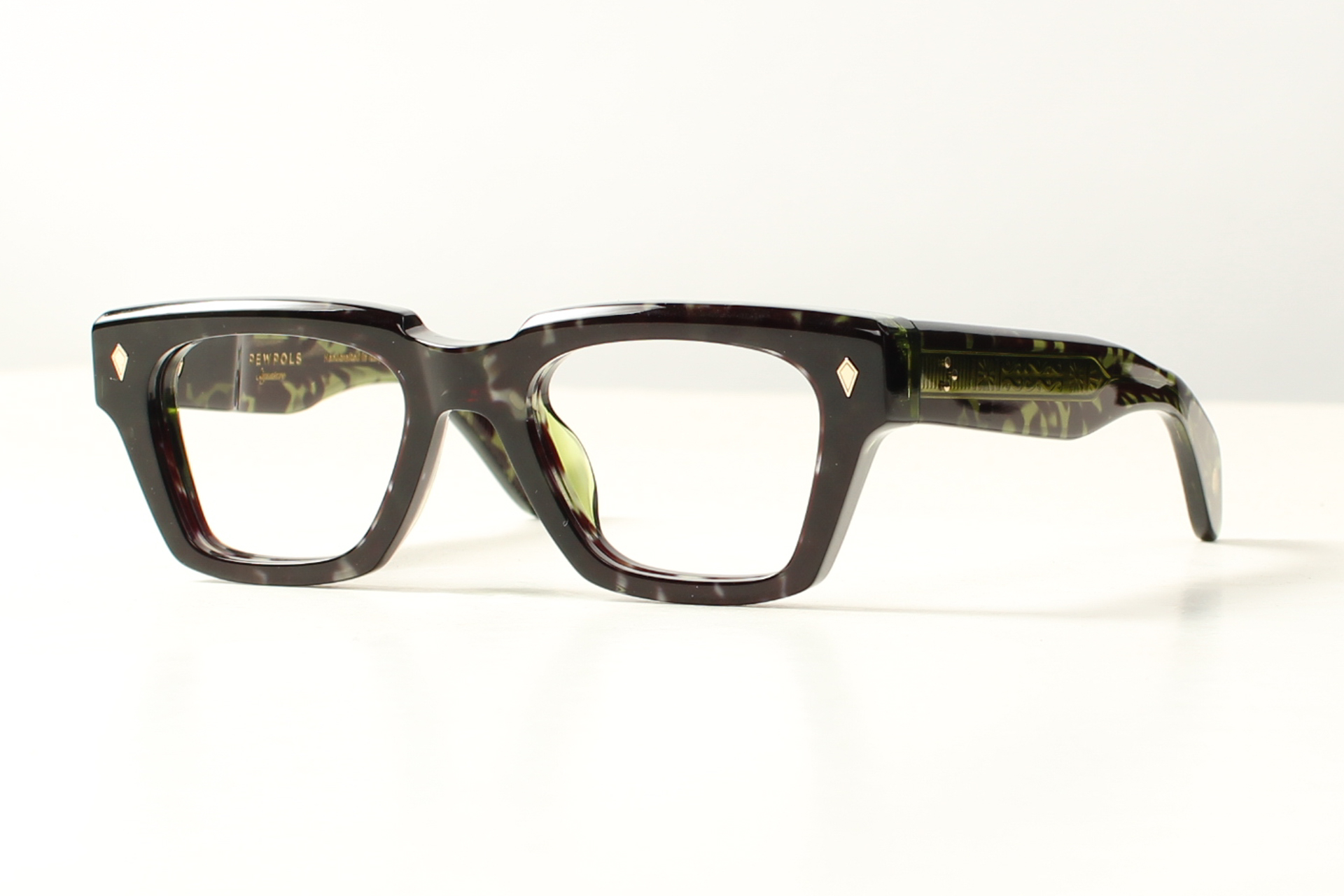 Gemaakt van Italiaans gevlekt groen acetaat van de hoogste kwaliteit. Elk montuur is een uniek exemplaar met een eigen verhaal,