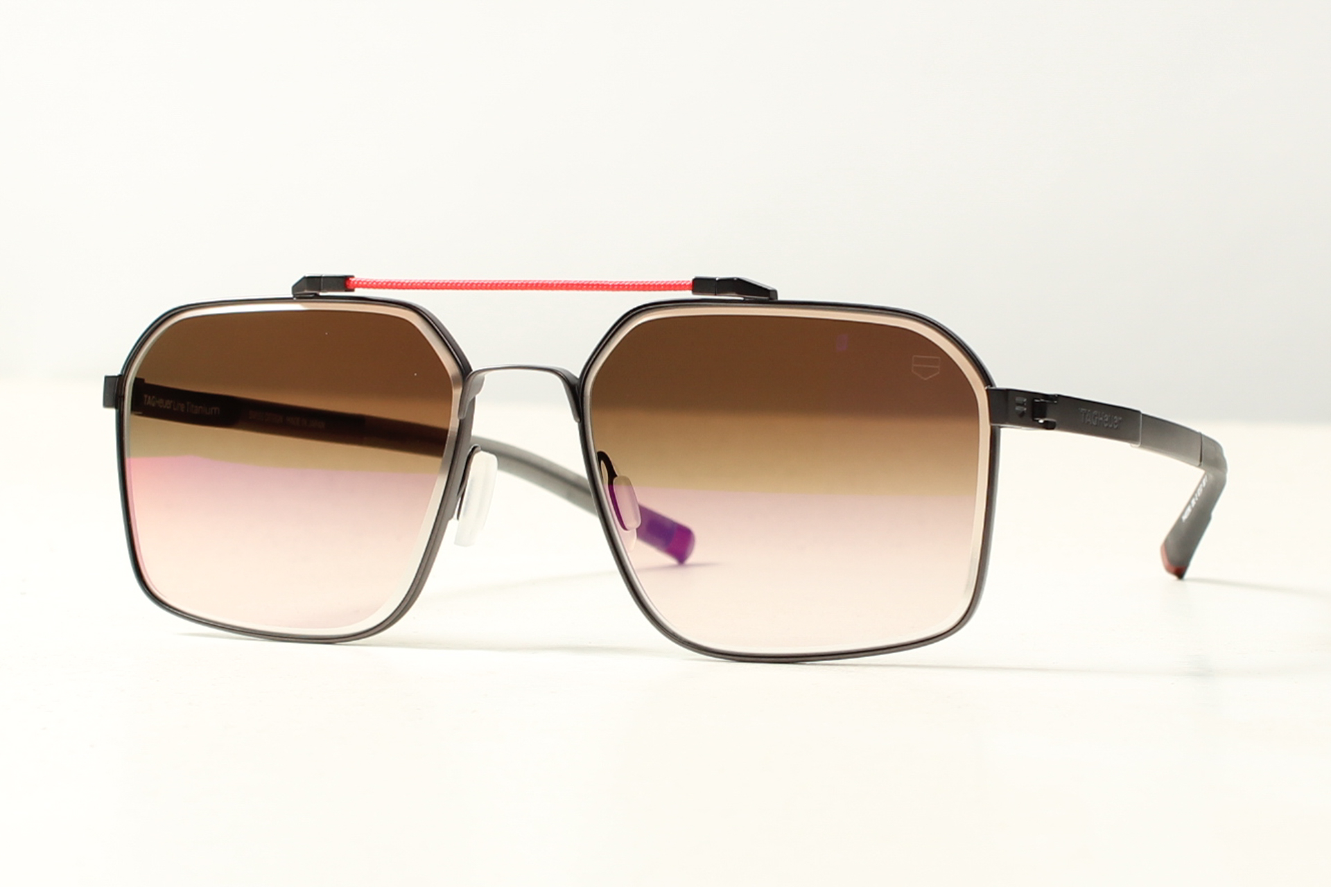 TAG Heuer Aviator zonnebril in antraciet zwart hoogwaardig titanium met bruin degrade glazen. Design met de focus op pasvorm en comfort.