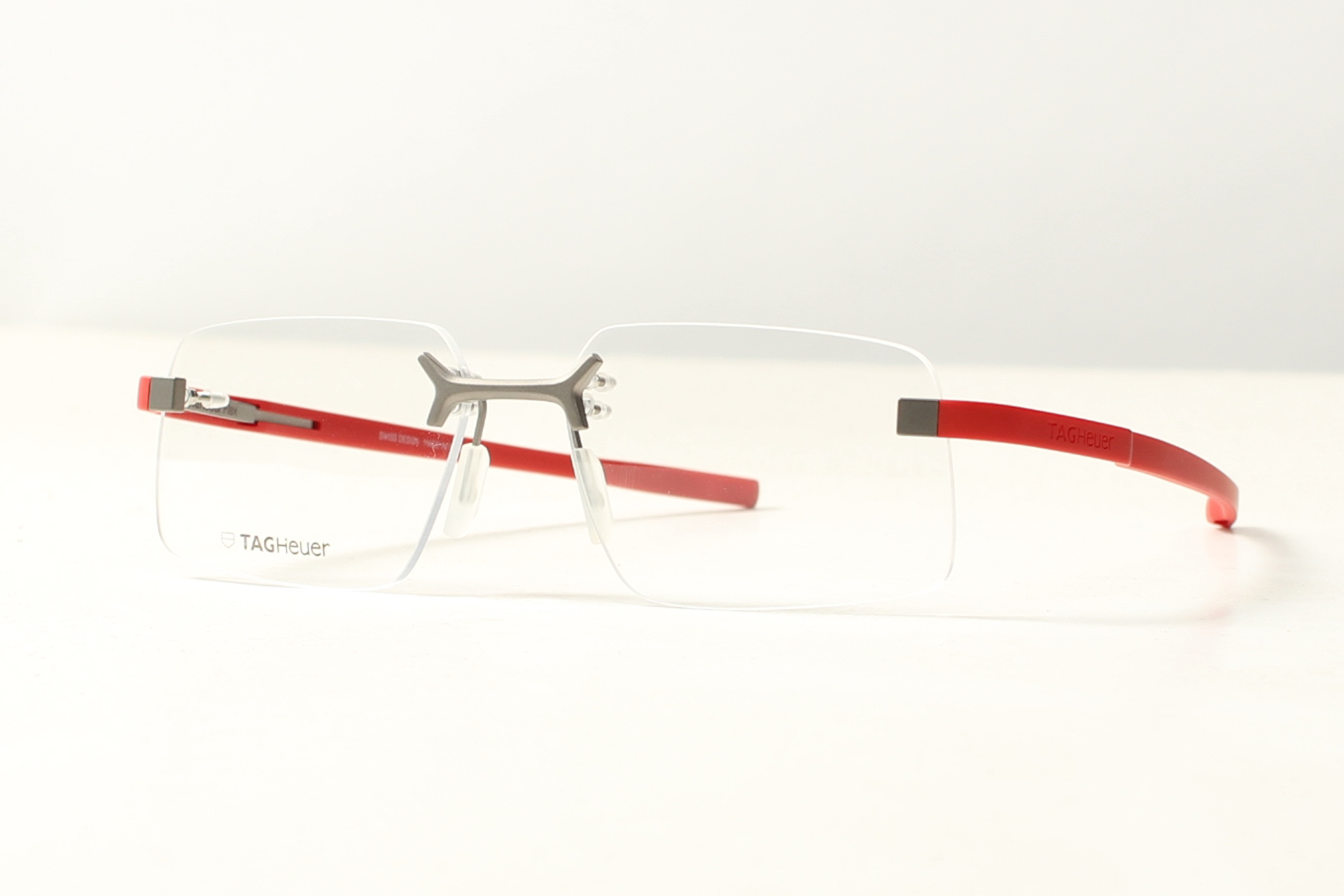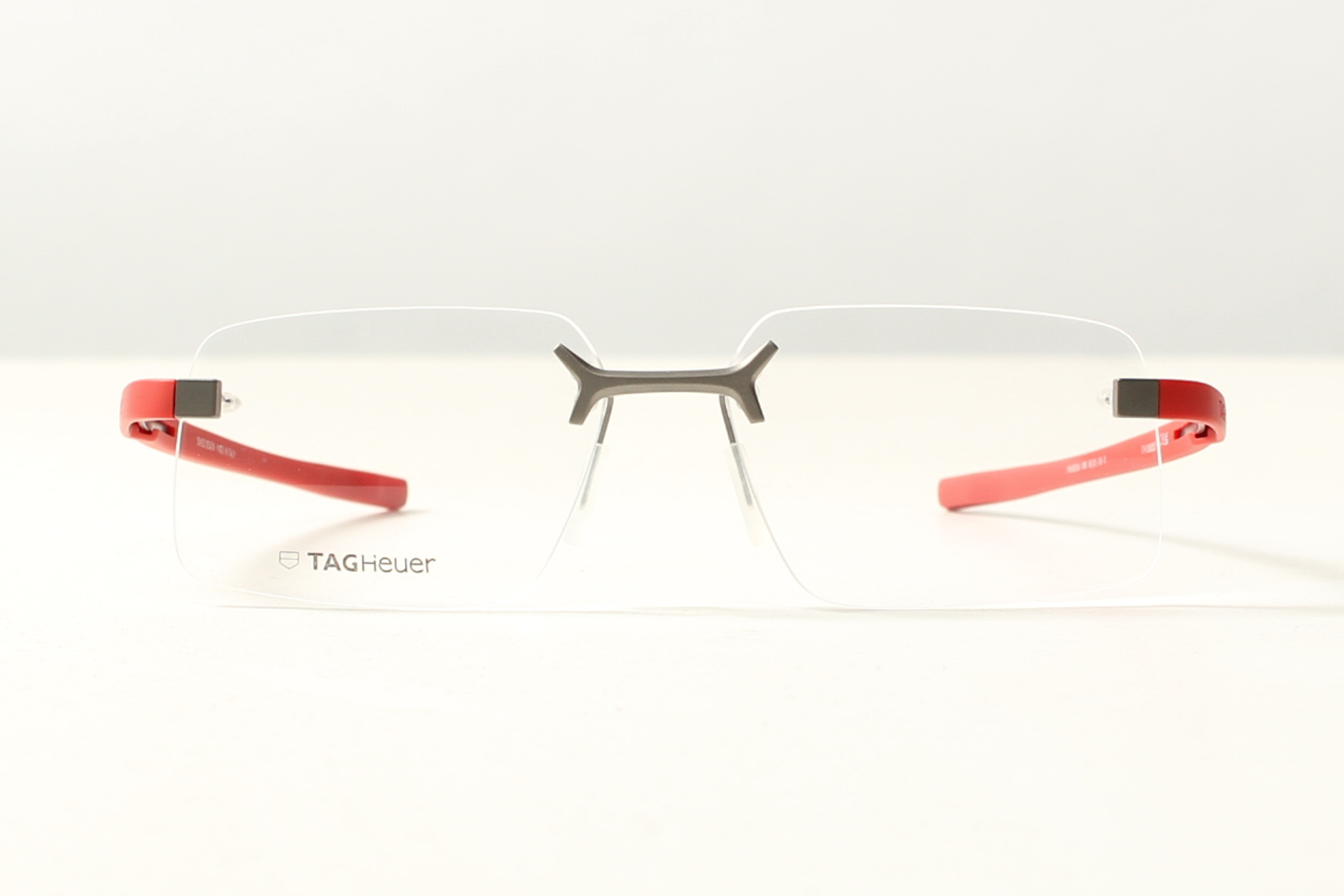 TAG Heuer randloos montuur met rode steekveren. Design met de focus op pasvorm en comfort.