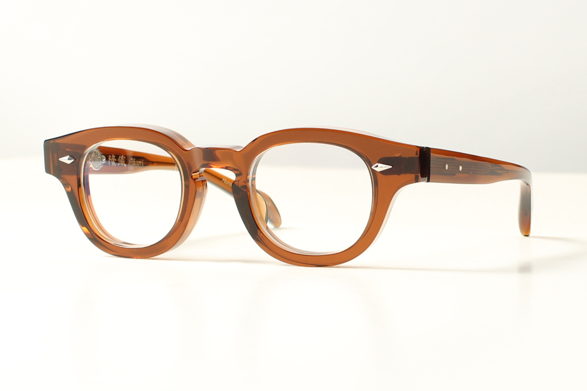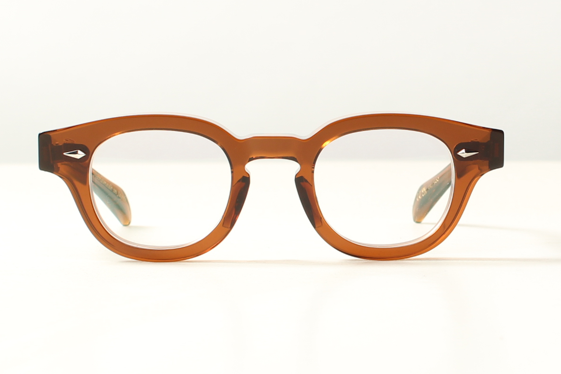 Prachtig montuur in transparant bruin acetaat, handgemaakt in Japan door meesterlijke ambachtslieden.