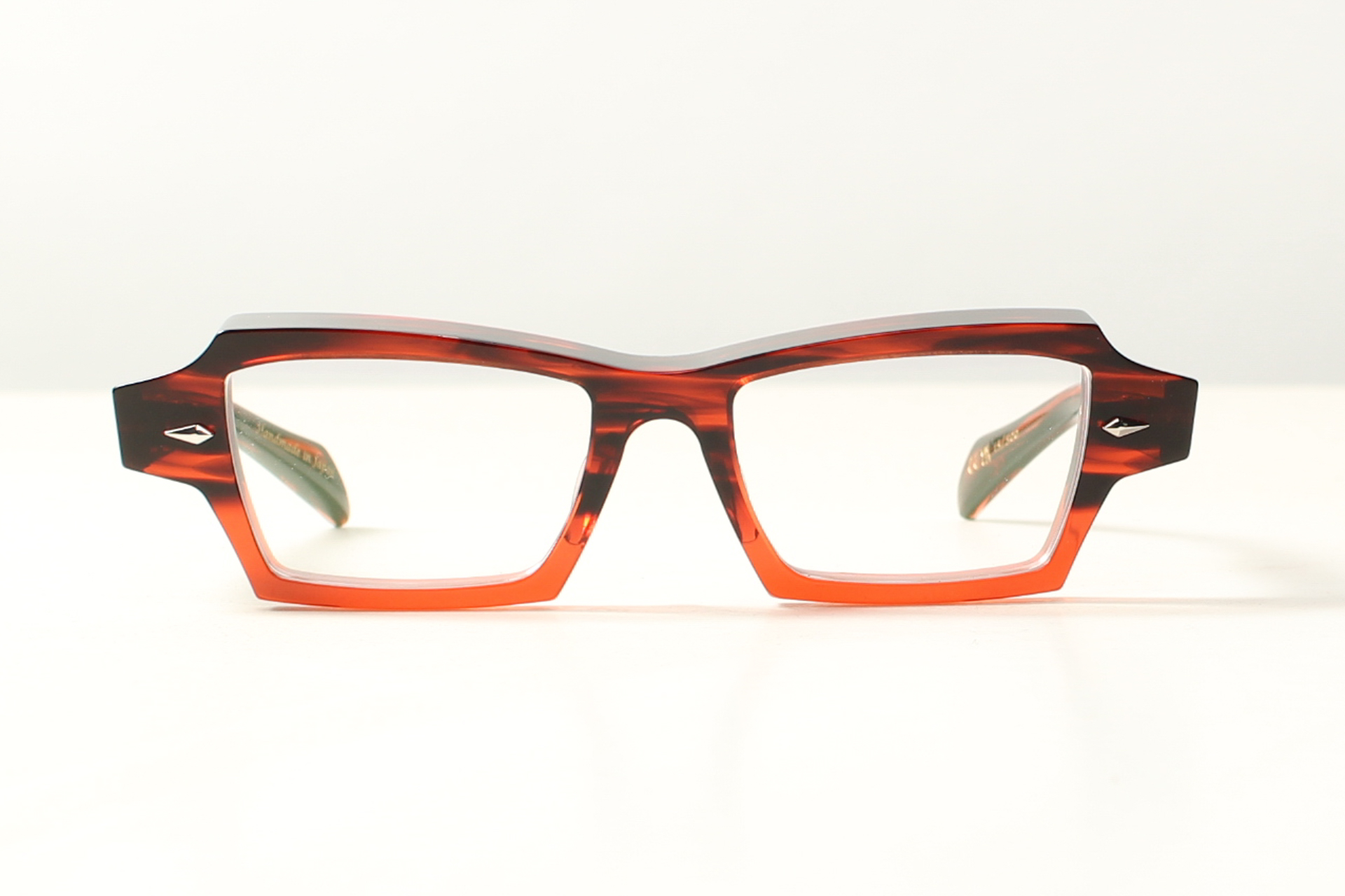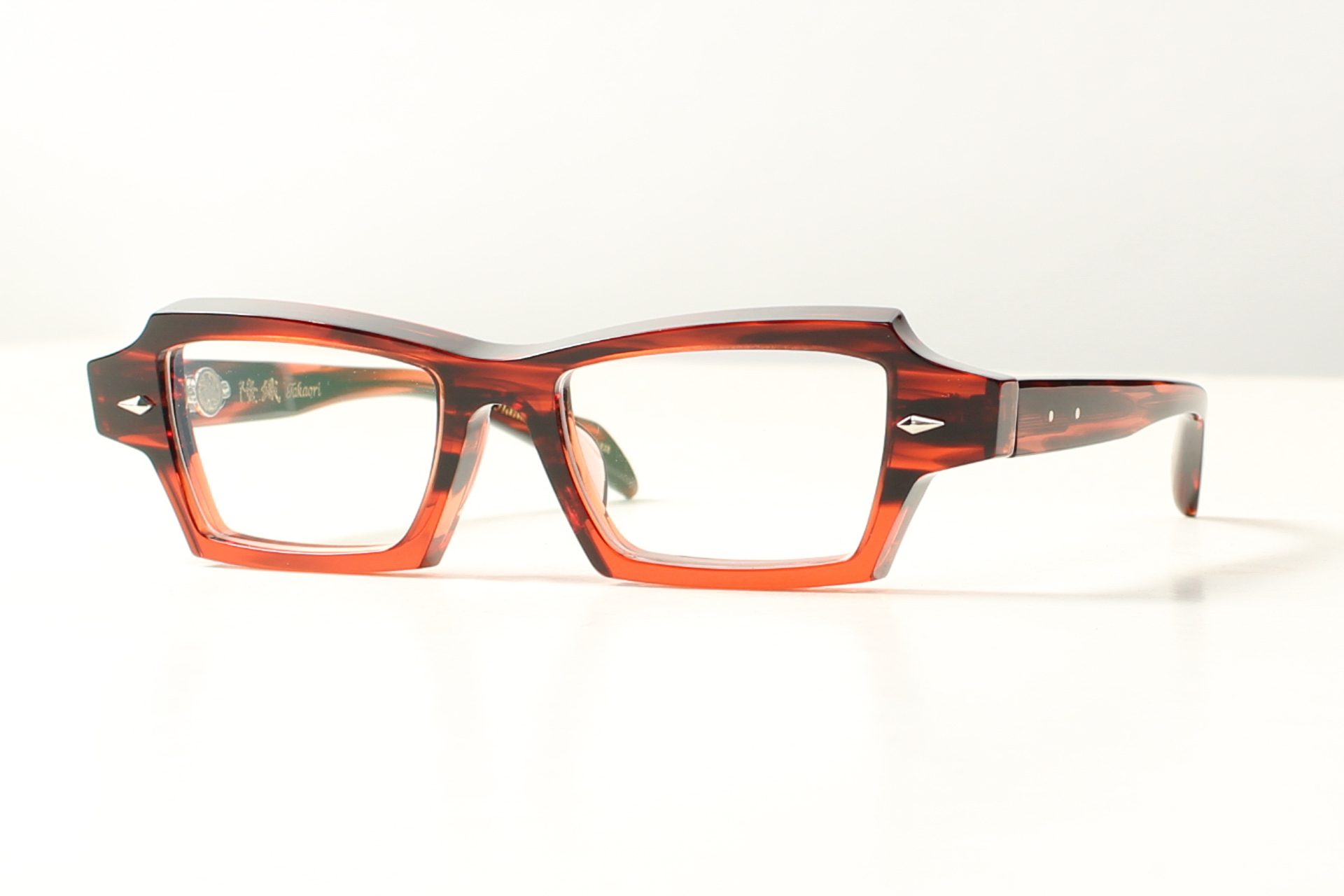 Prachtig montuur van Takaori in bruin gevlamd acetaat. Bijzonder fraai klinkscharnier en handgemaakt in Japan door meesterlijke ambachtslieden.