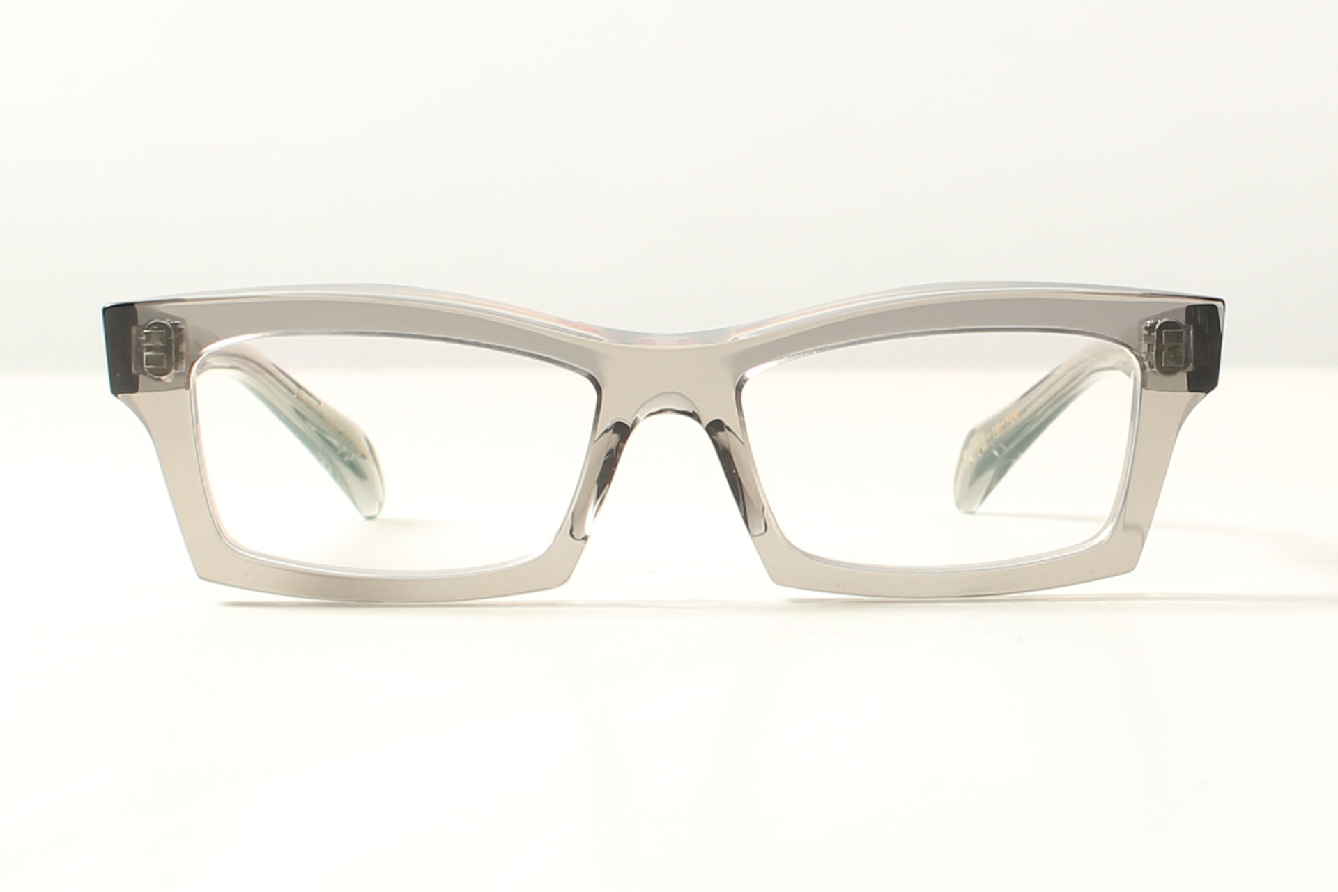 Prachtig rechthoekig montuur van Takaori in transpanrant grijs acetaat. Bijzonder fraai door de schuine facetten. Handgemaakt in Japan door meesterlijke ambachtslieden