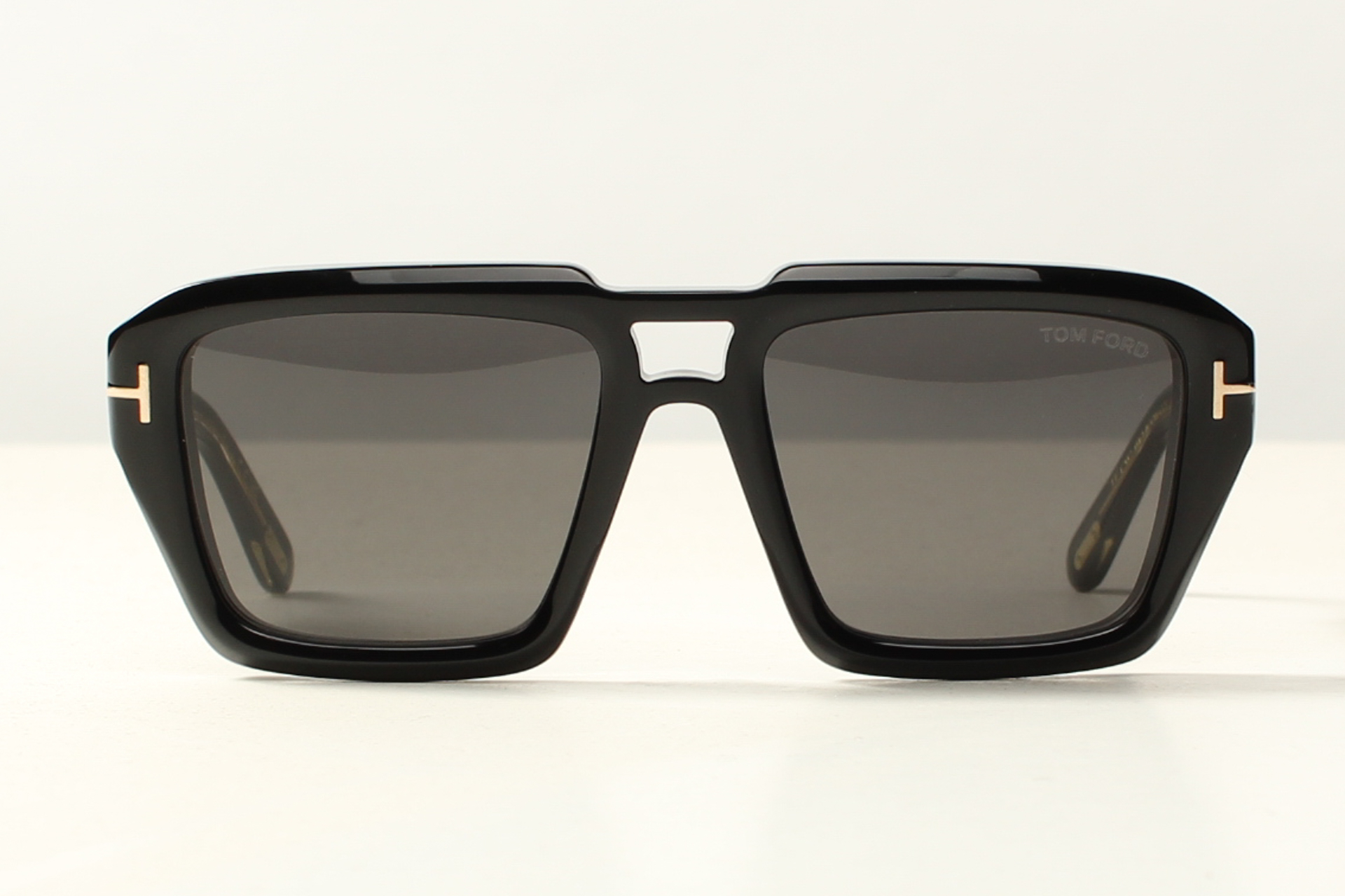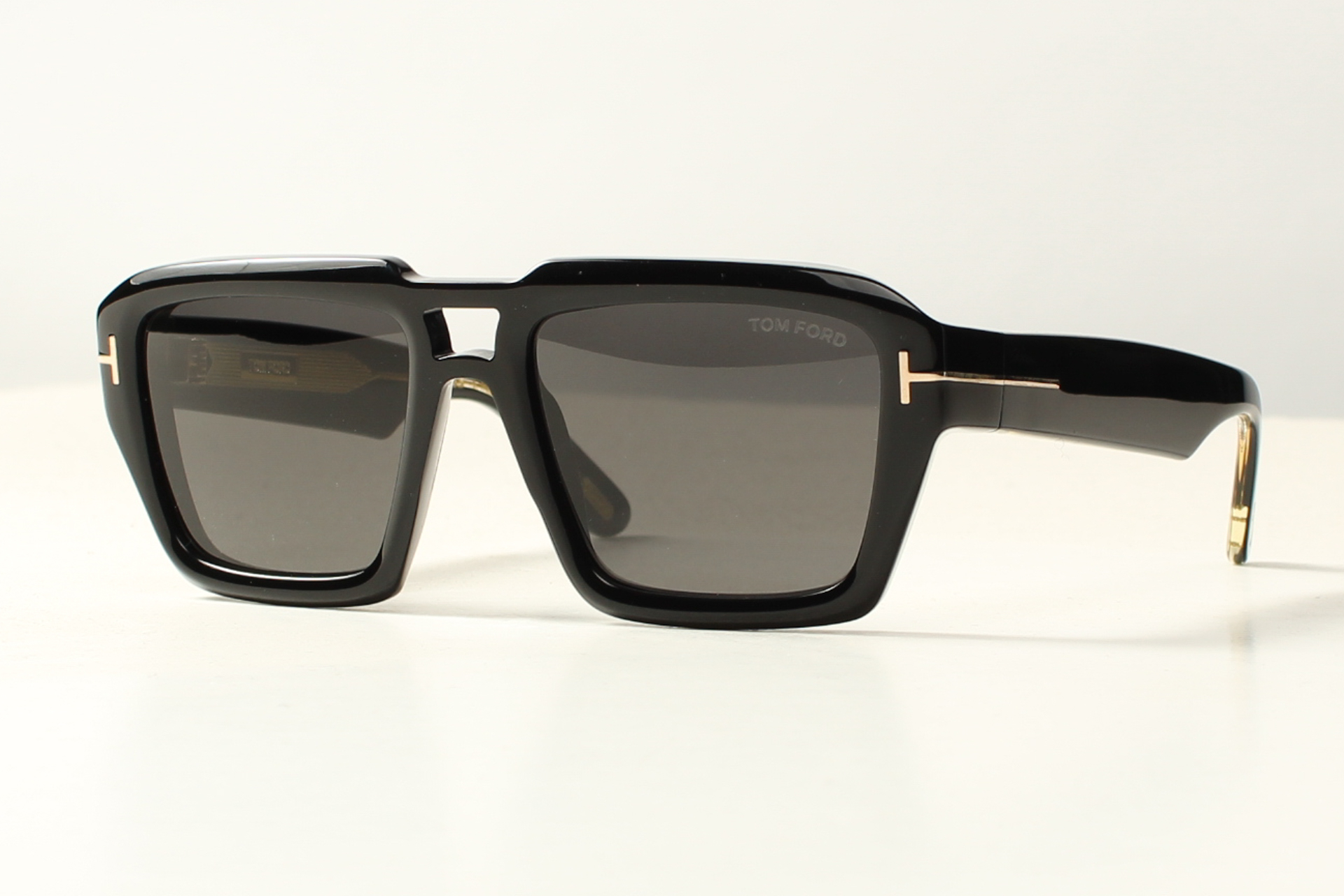 Bril van Tom Ford uit de Icon collectie, glanzend zwart acetaat met T-logo op de veren en grijze glazen.