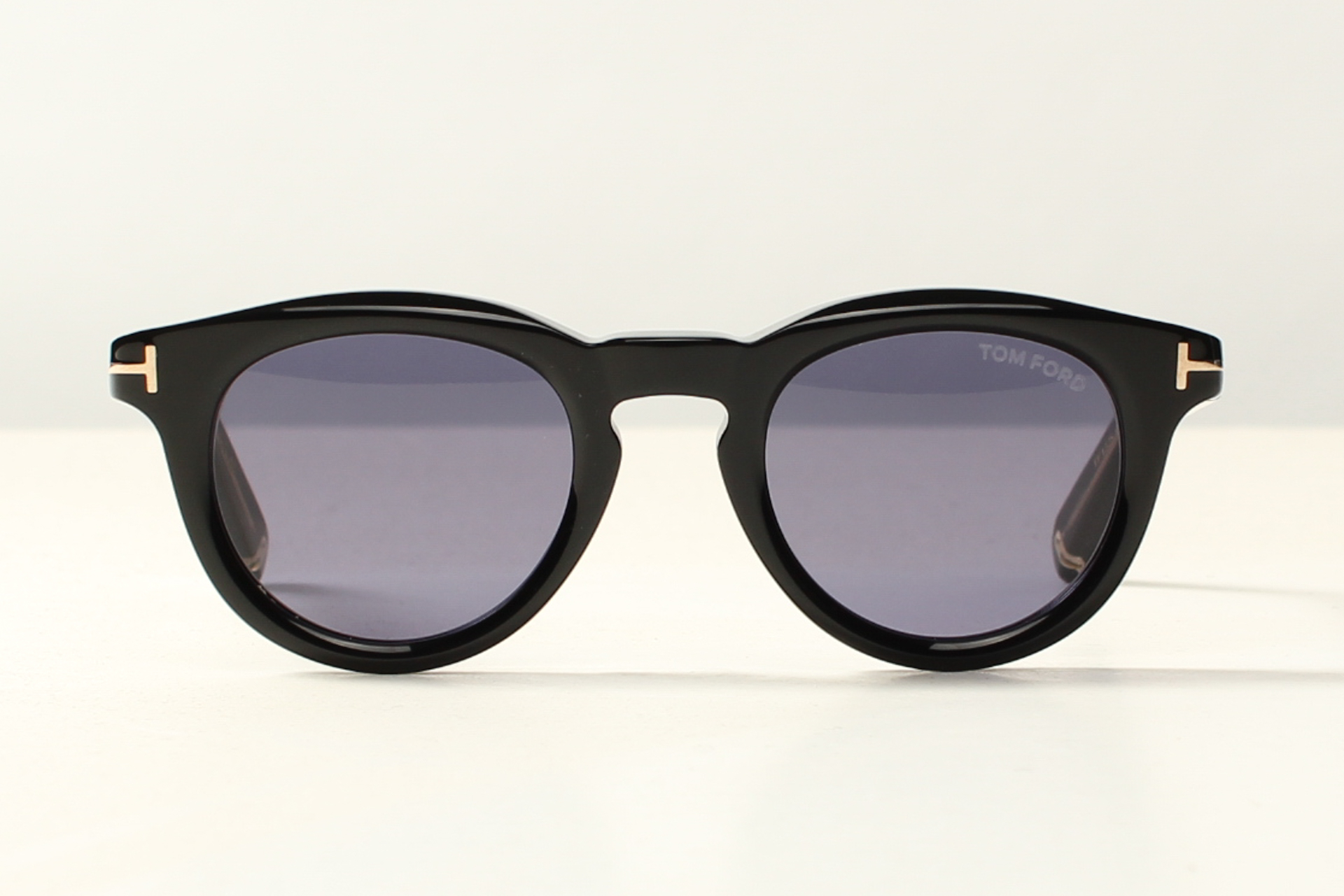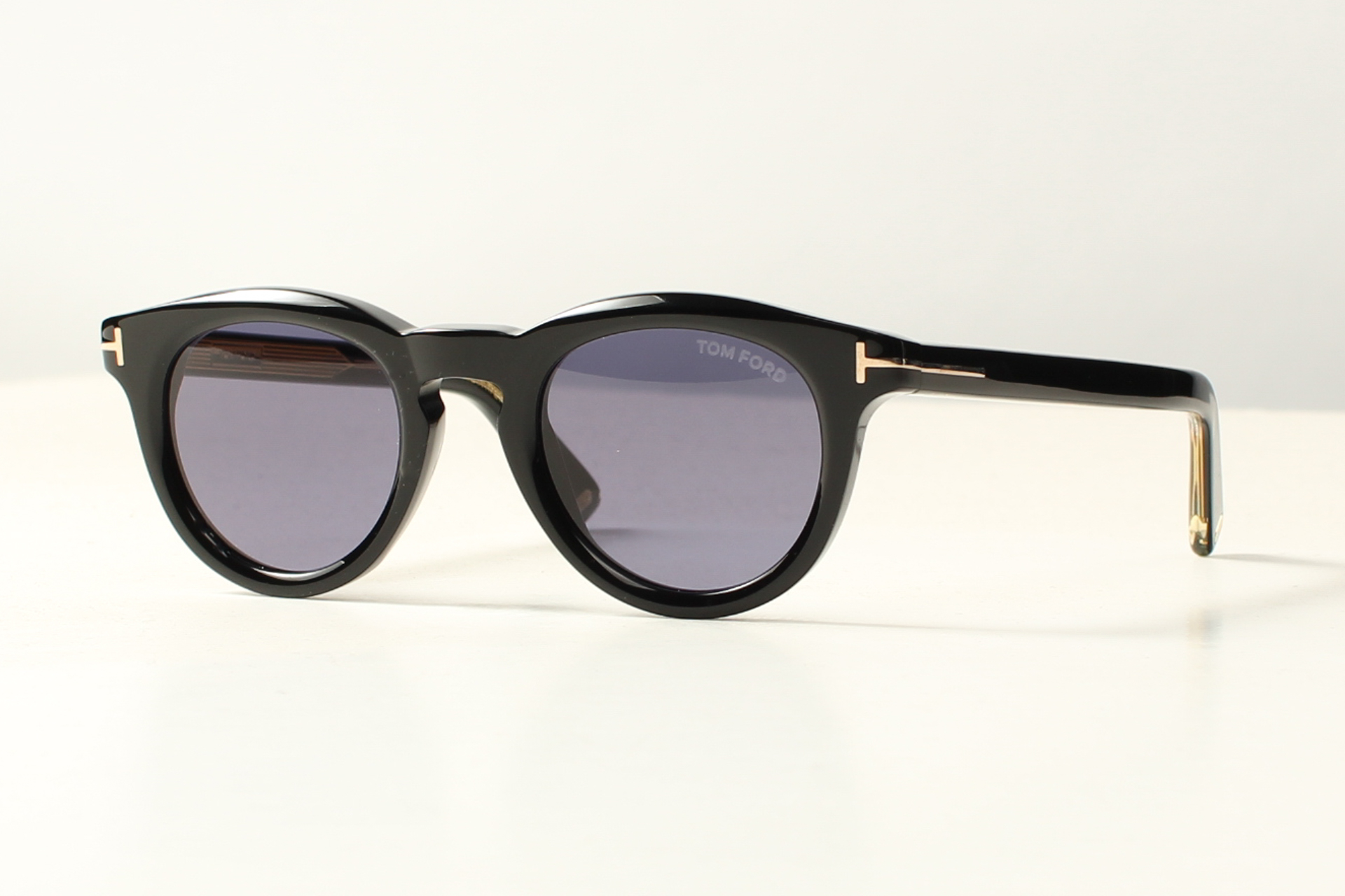 Glanzend zwart acetaat zonnebril van Tom Ford uit de Icon collectie. In fraaie panto vorm met grijze glazen.