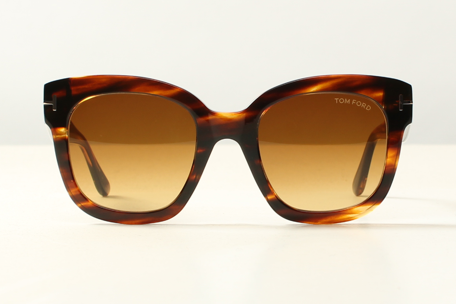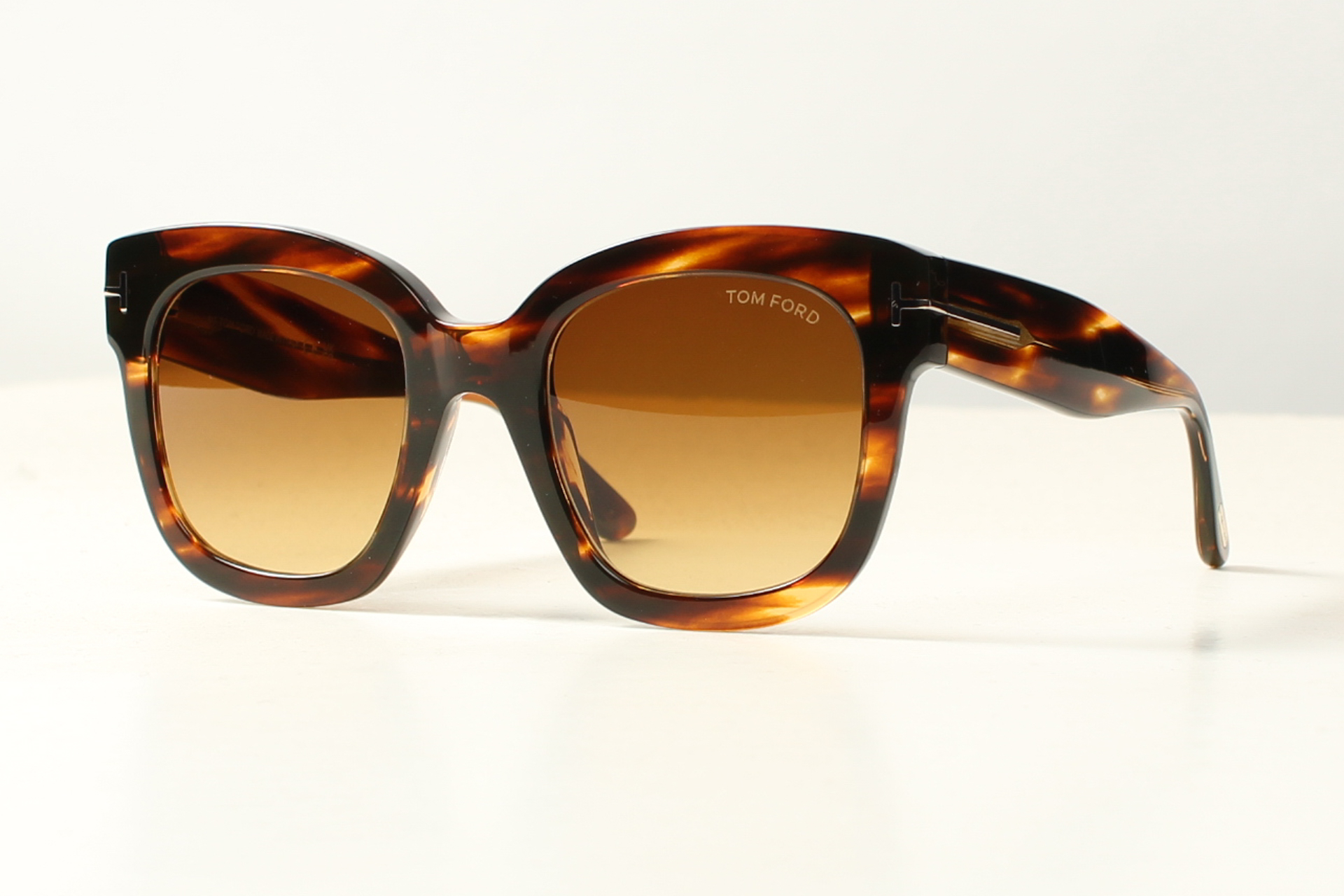 Donker gevlamd acetaat zonnebril van Tom Ford in sierlijke vlindervorm met bruin degrade glazen.