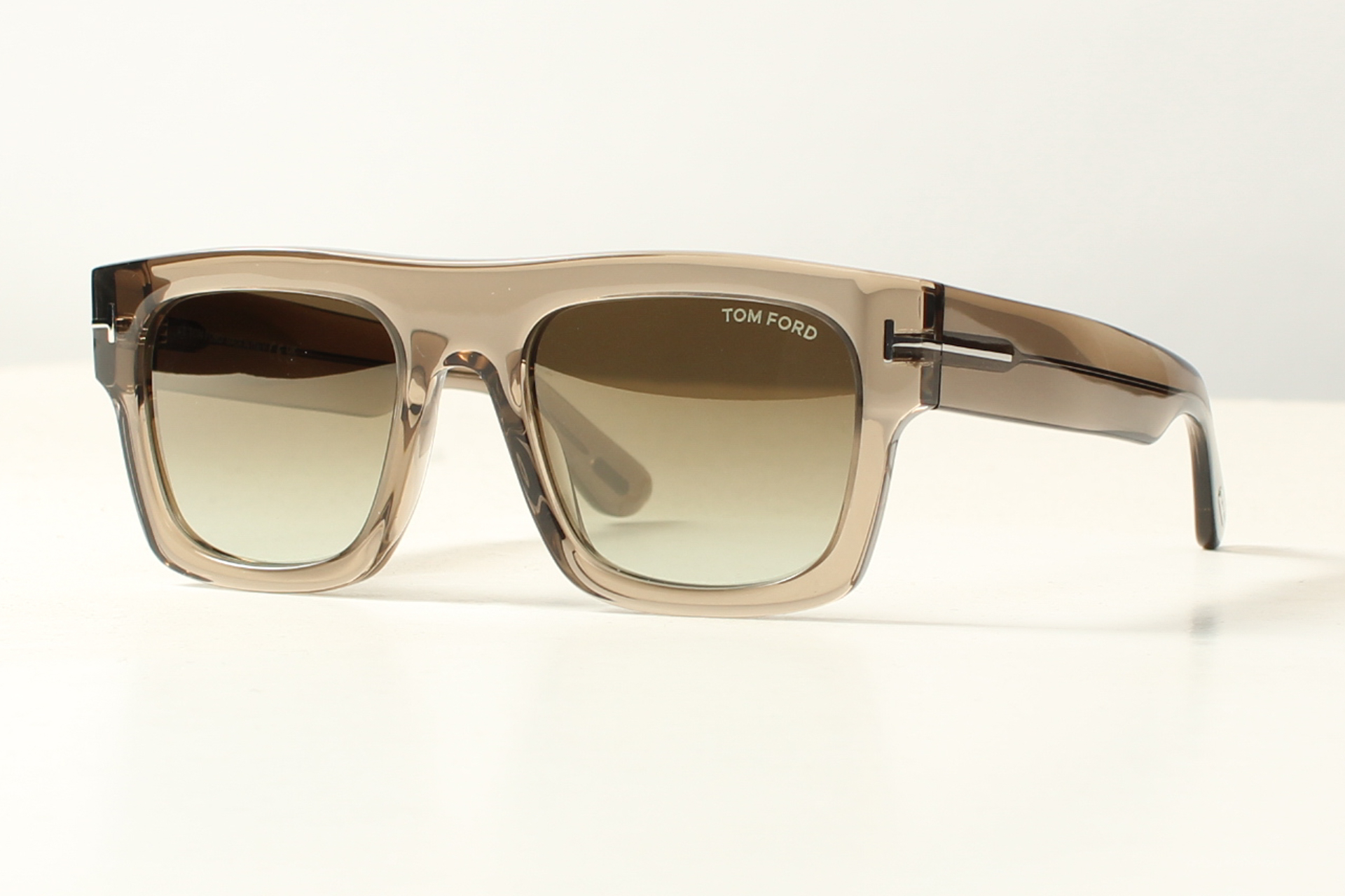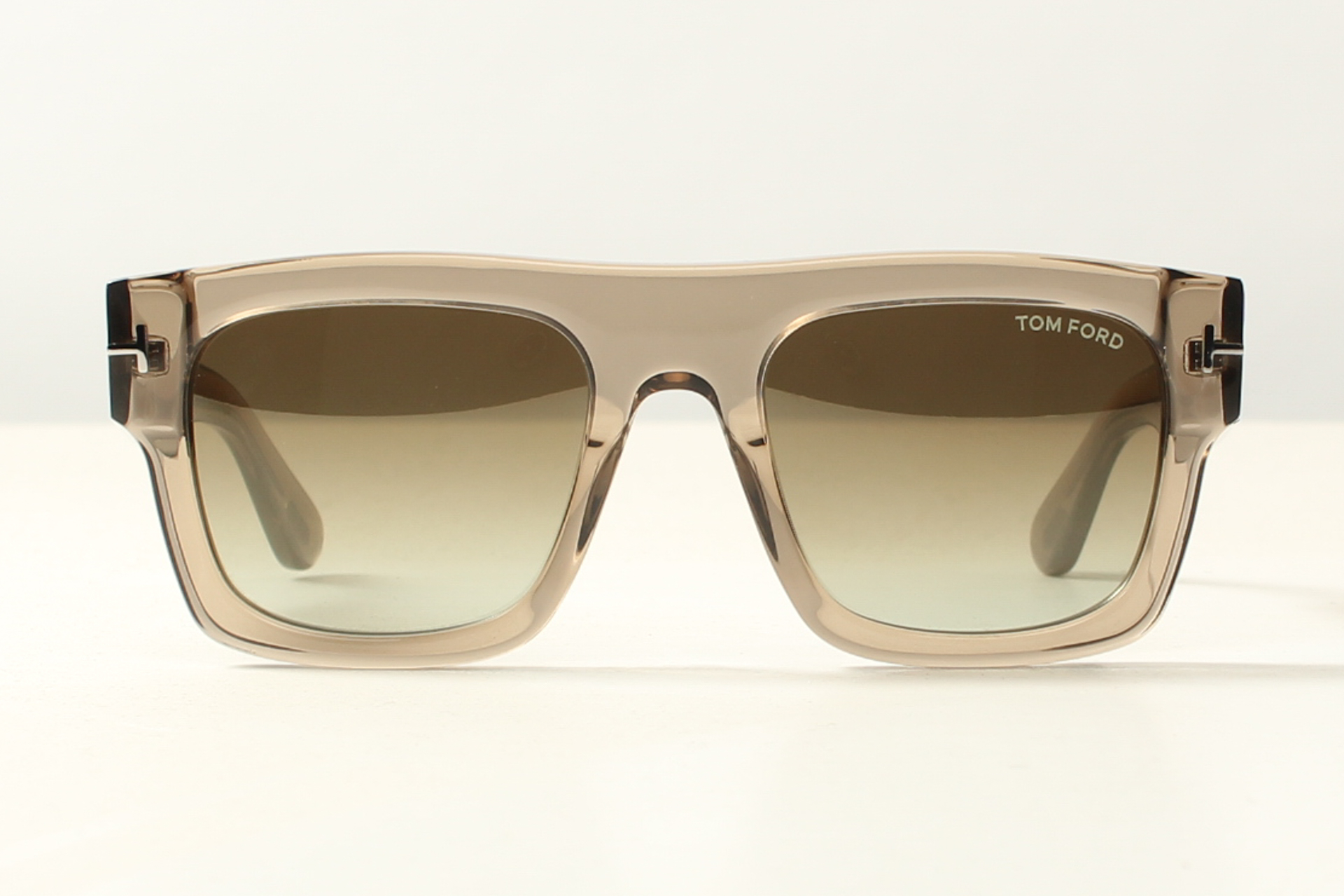 Tom Ford zonnebril gepolijst transparant beige acetaat met bruine glazen.