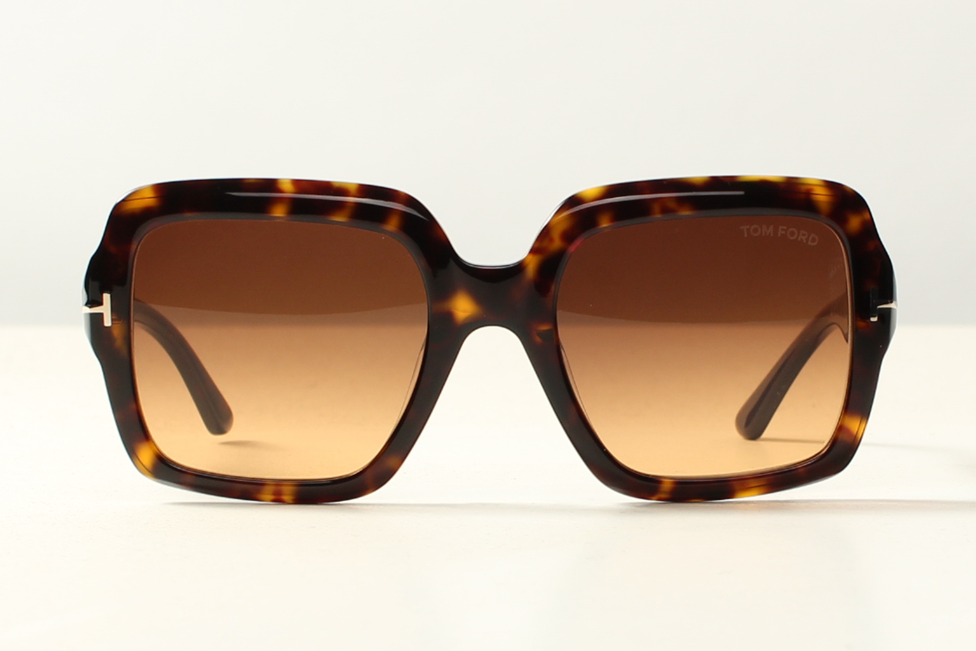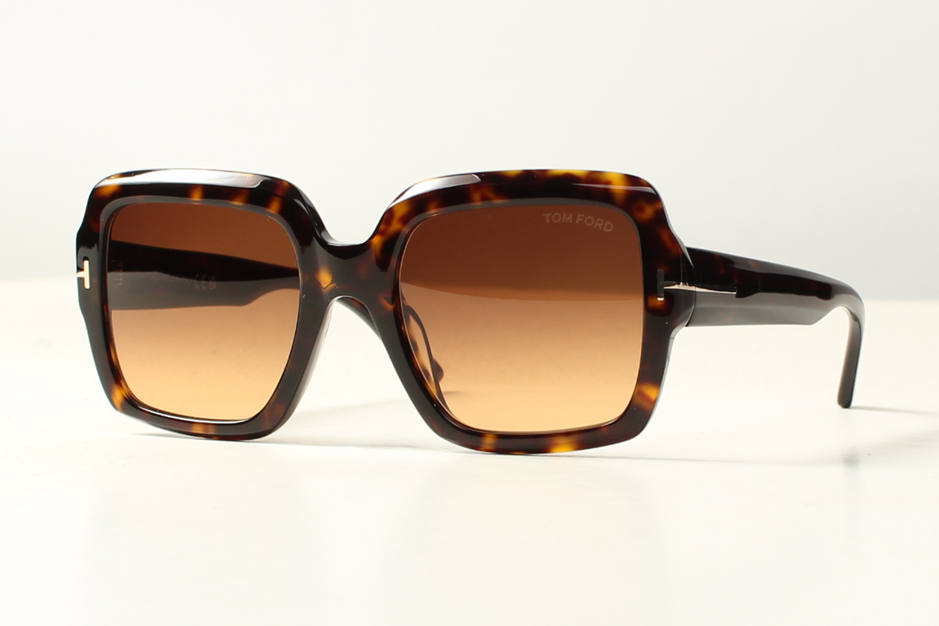 Donker gevlamd acetaat zonnebril van Tom Ford vierkante vorm met bruin degrade glazen.