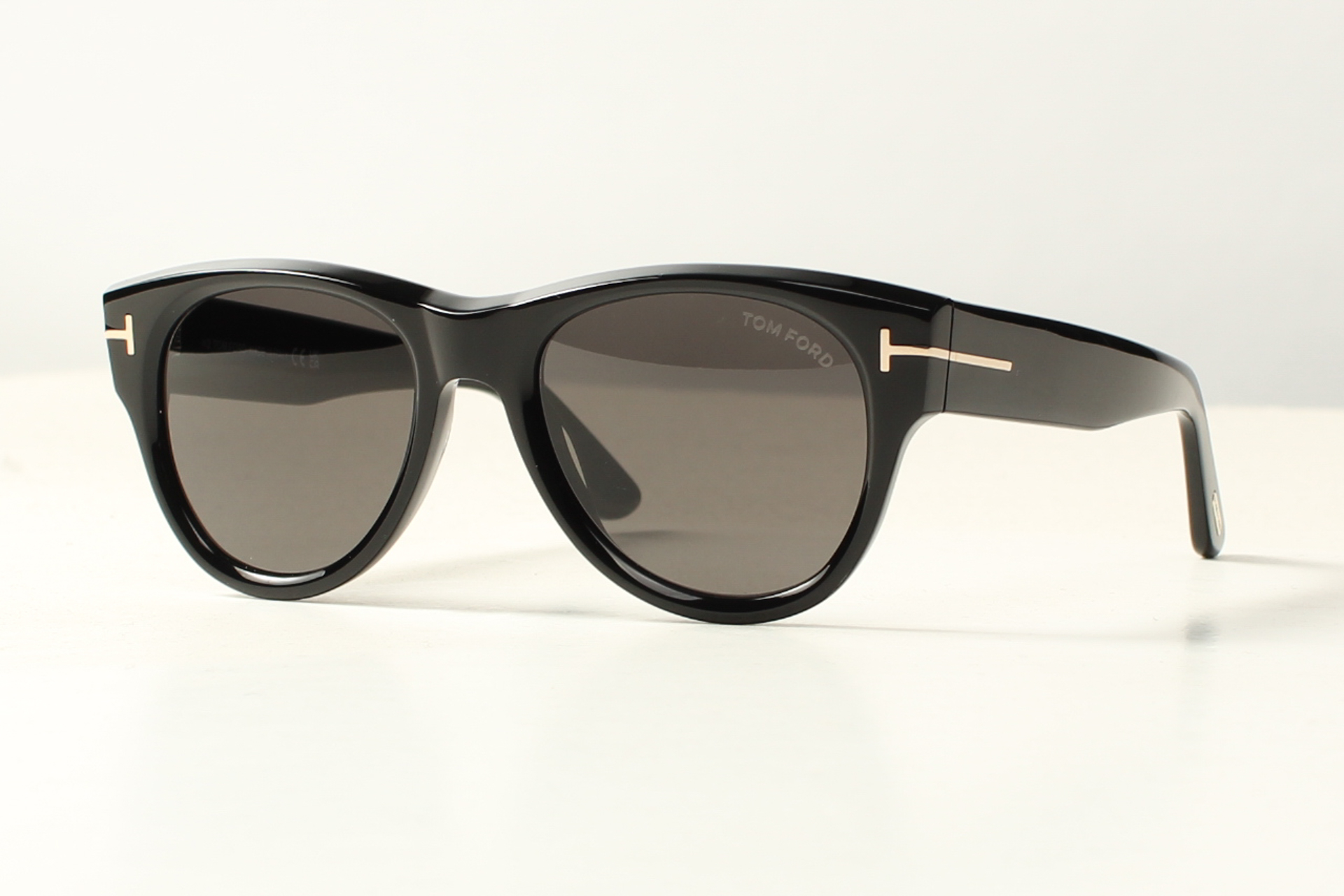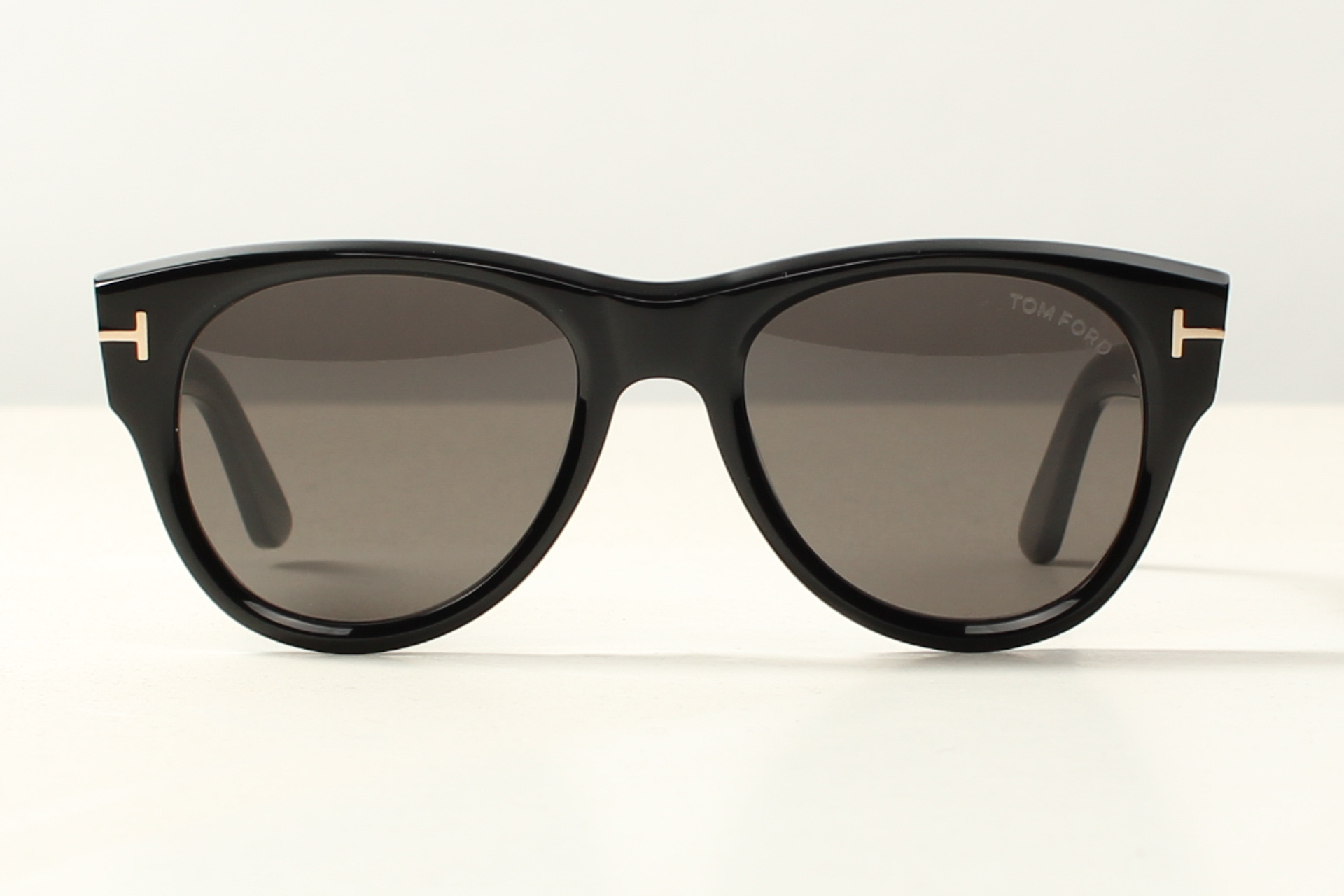 Tom Ford zonnebril in glanzend zwart acetaat met donker grijze glazen en het kenmerkende T-logo overlopend in de veer.
