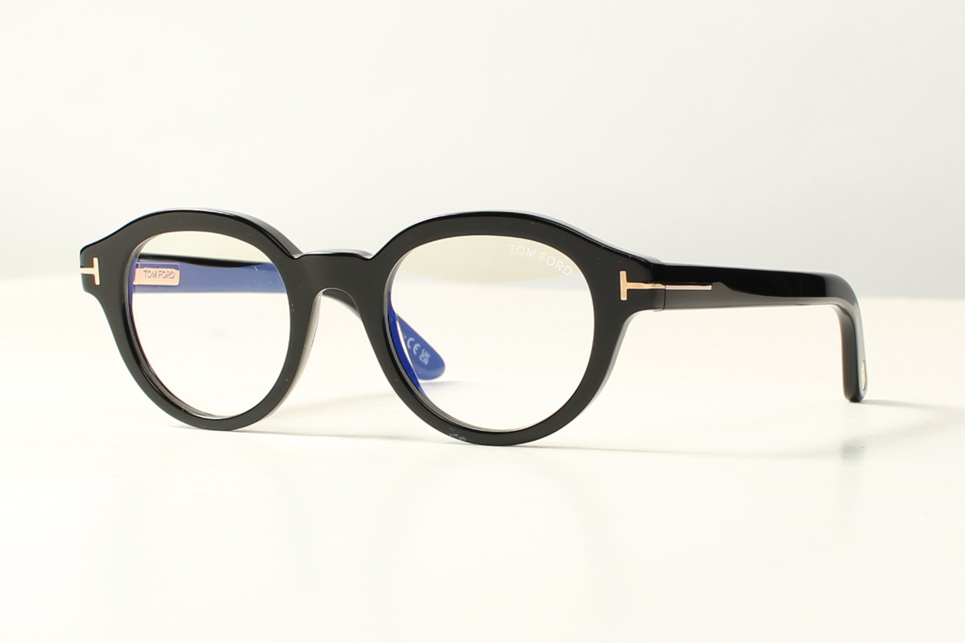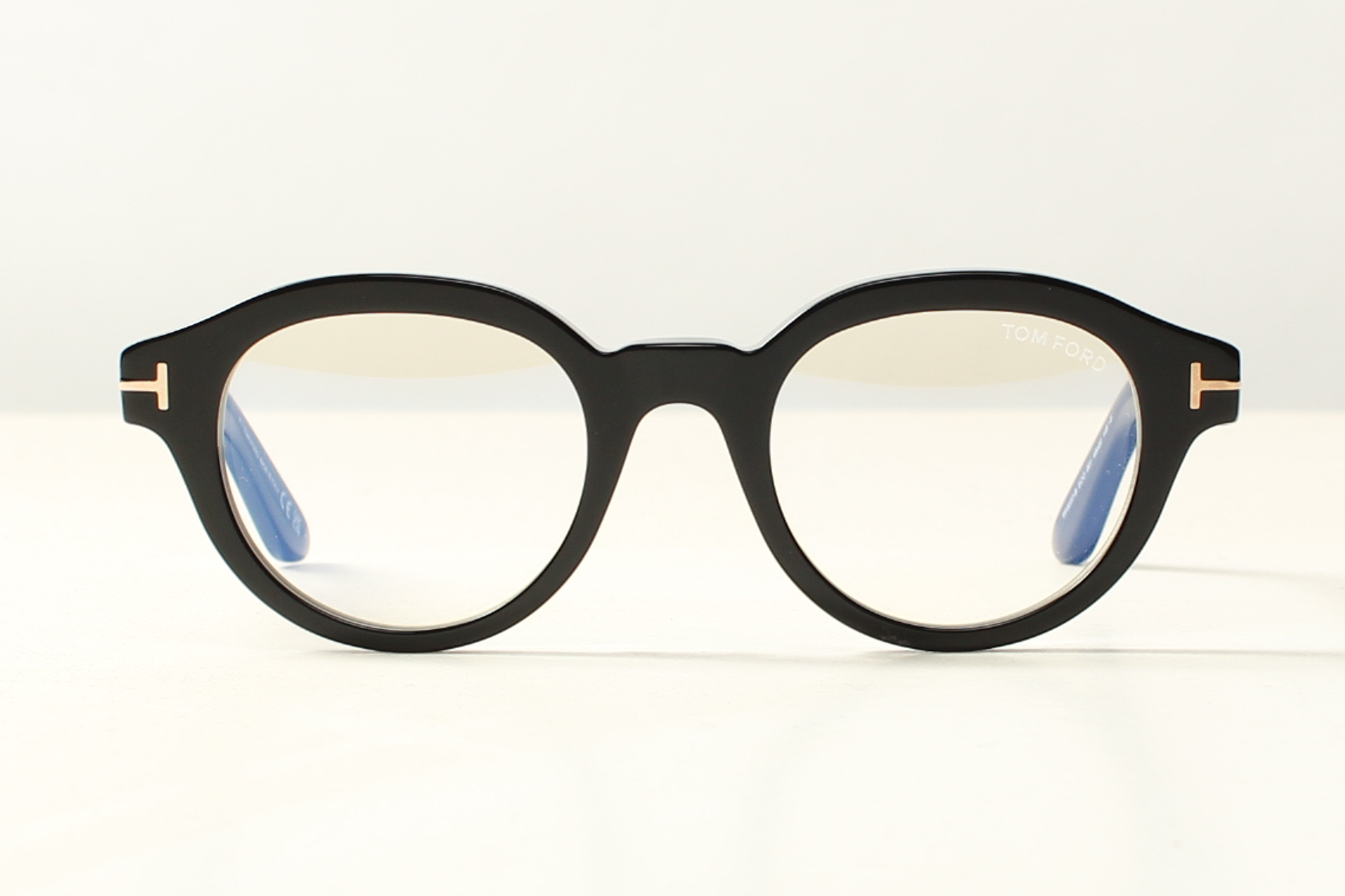 Panto-rond montuur in zwart acetaat van TOM FORD met kenmerkend T-logo op de hoeken.