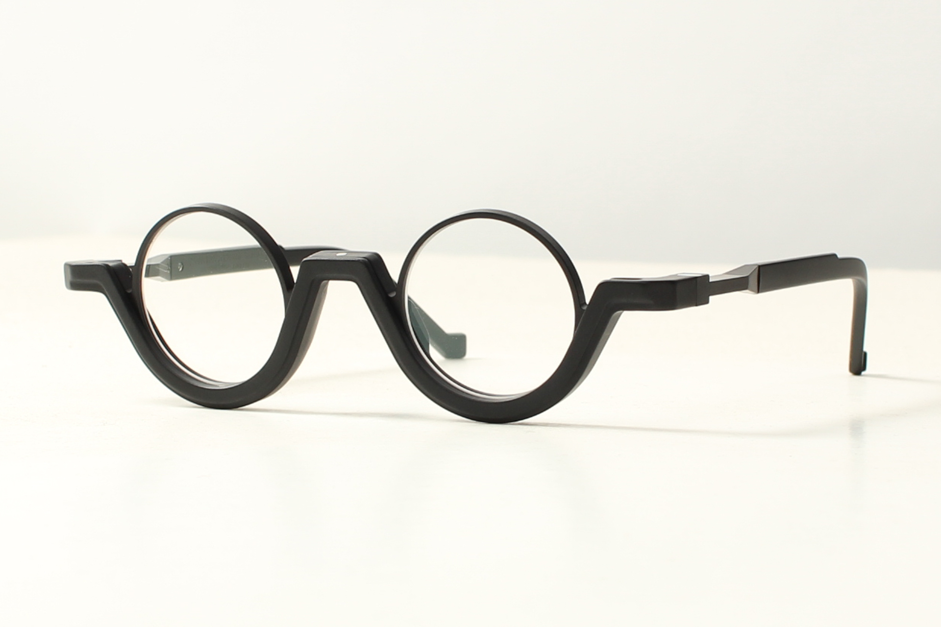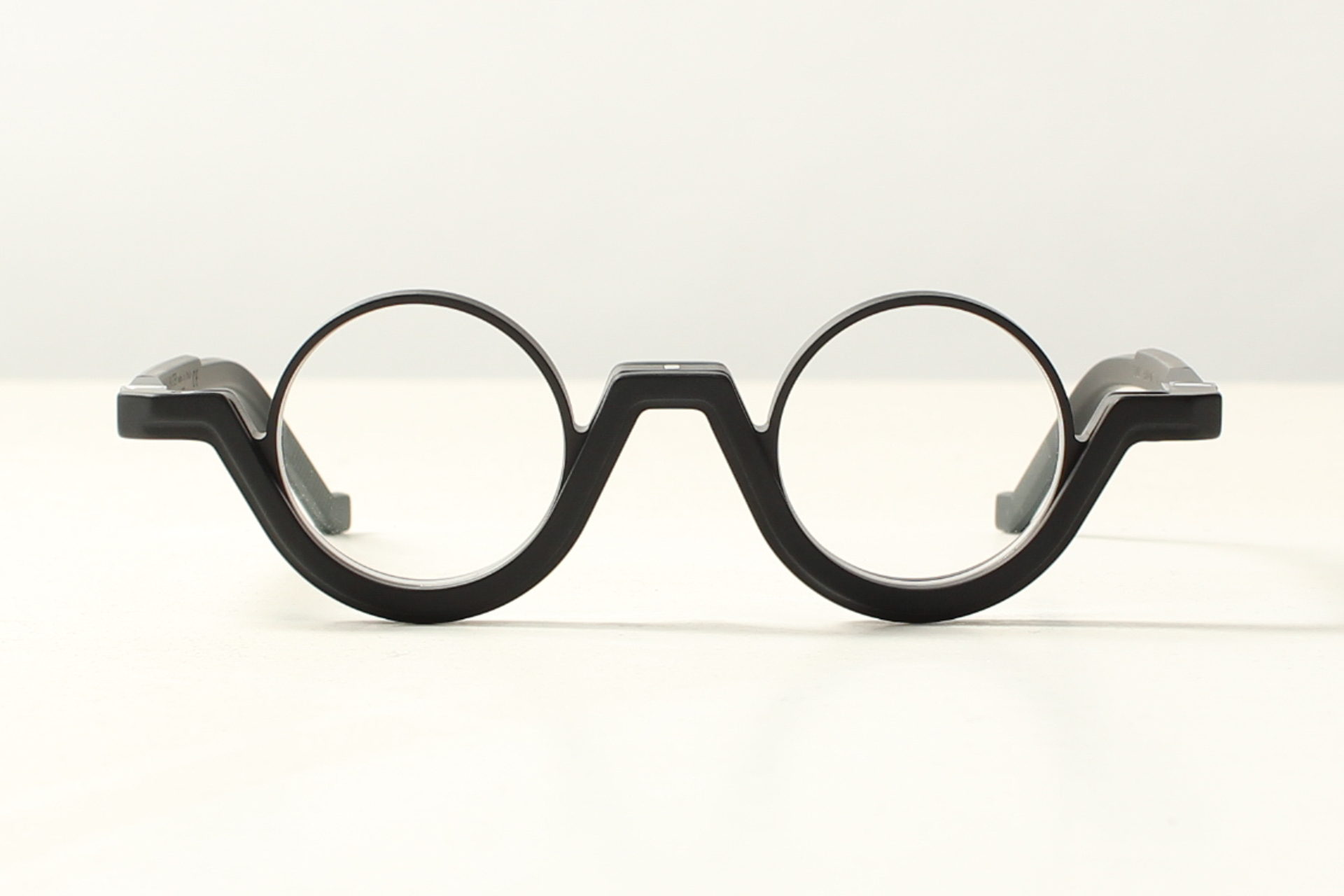 VAVA-montuur, ronde vorm in een combinatie van mat zwart aluminium en glanzend zwart acetaat. Futuristisch, conceptueel en tijdloos.