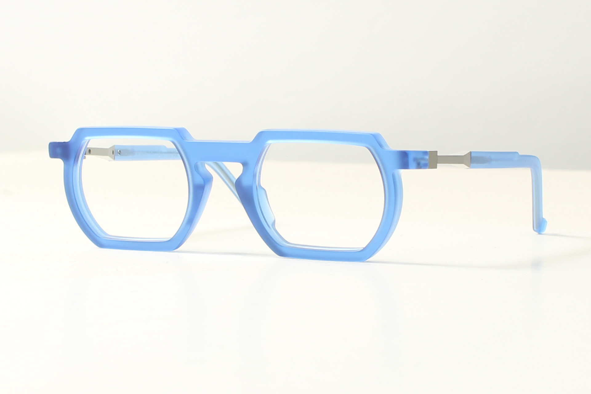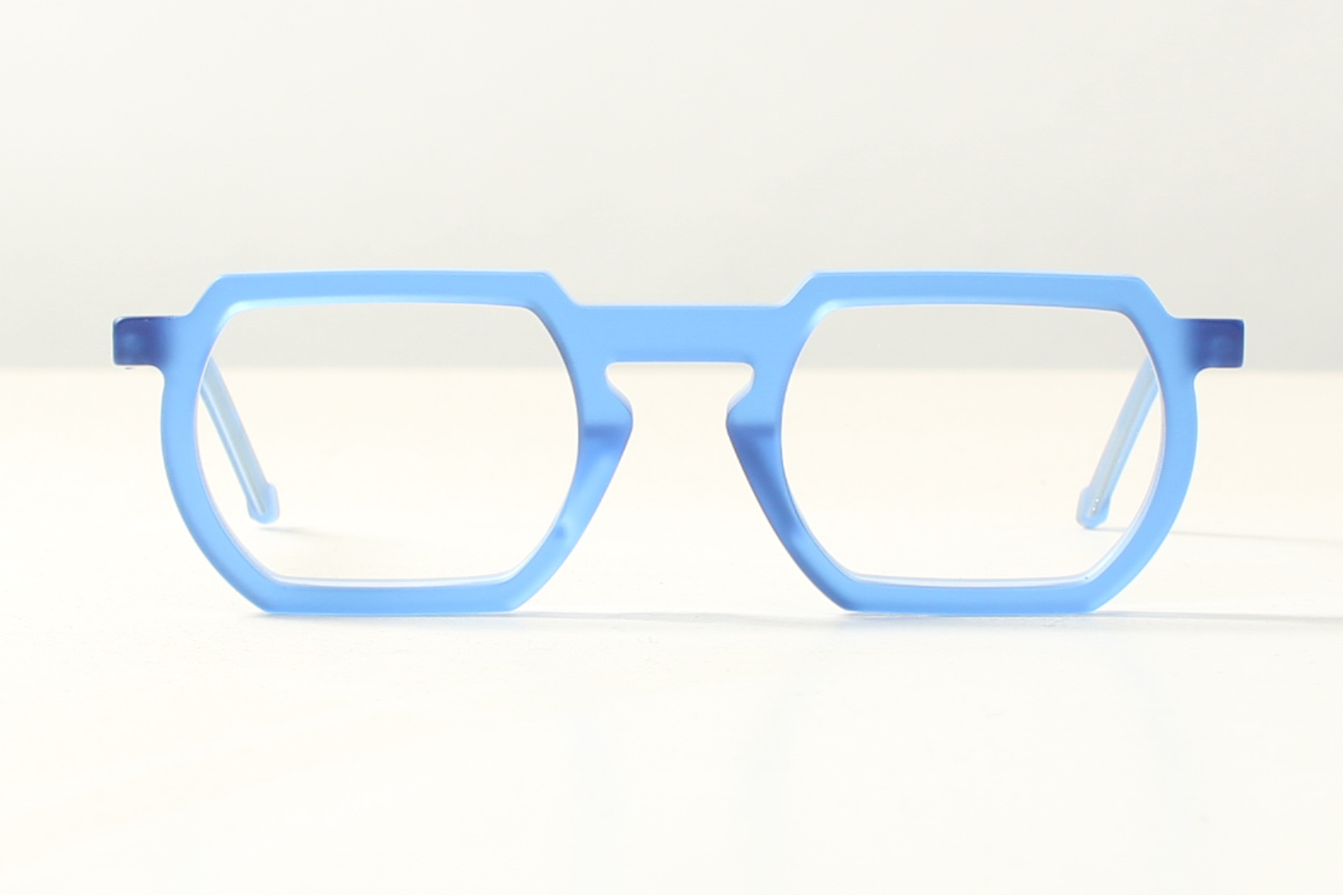 VAVA-montuur in mat blauw acetaat. Futuristisch, conceptueel en tijdloos.