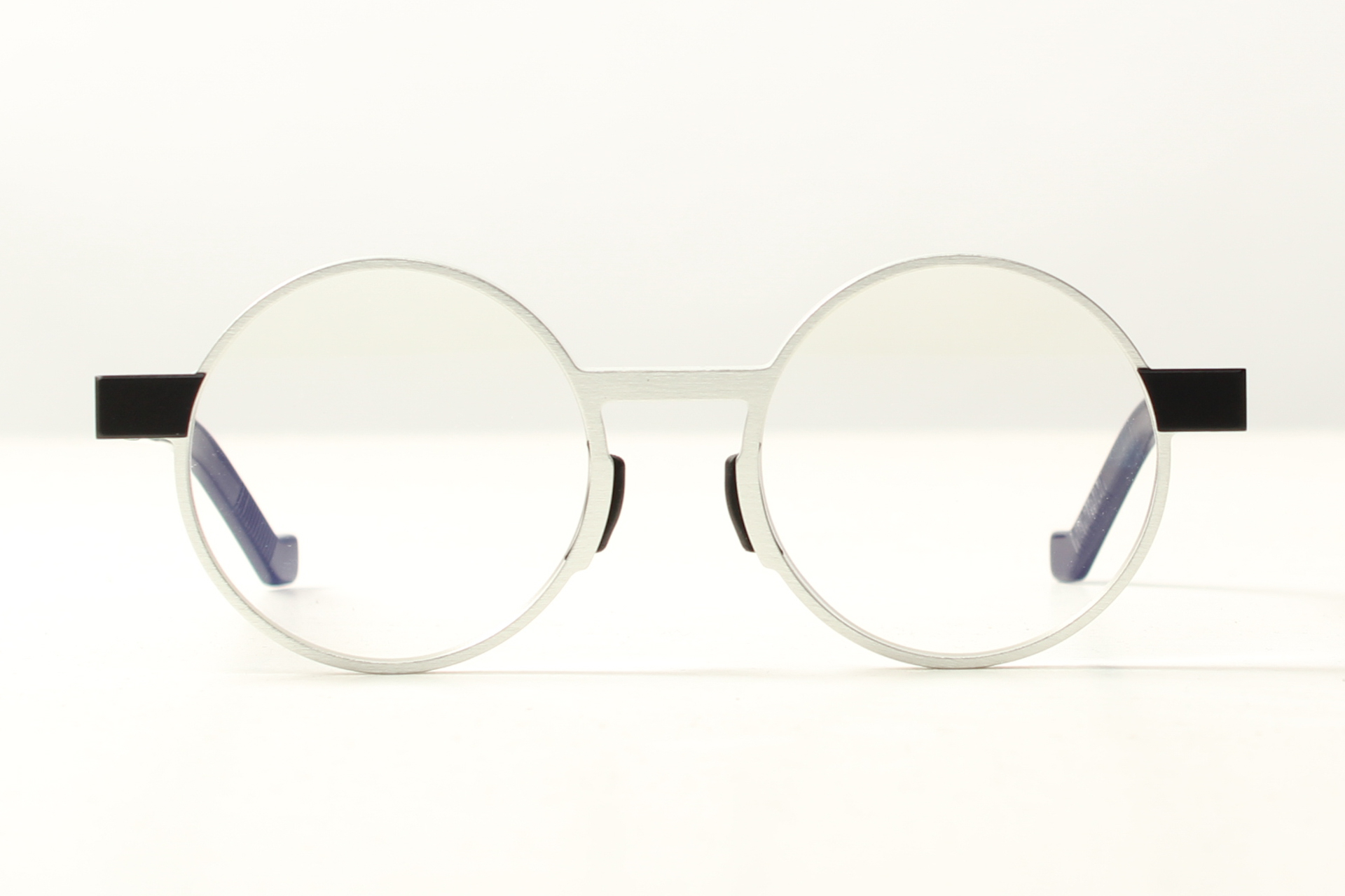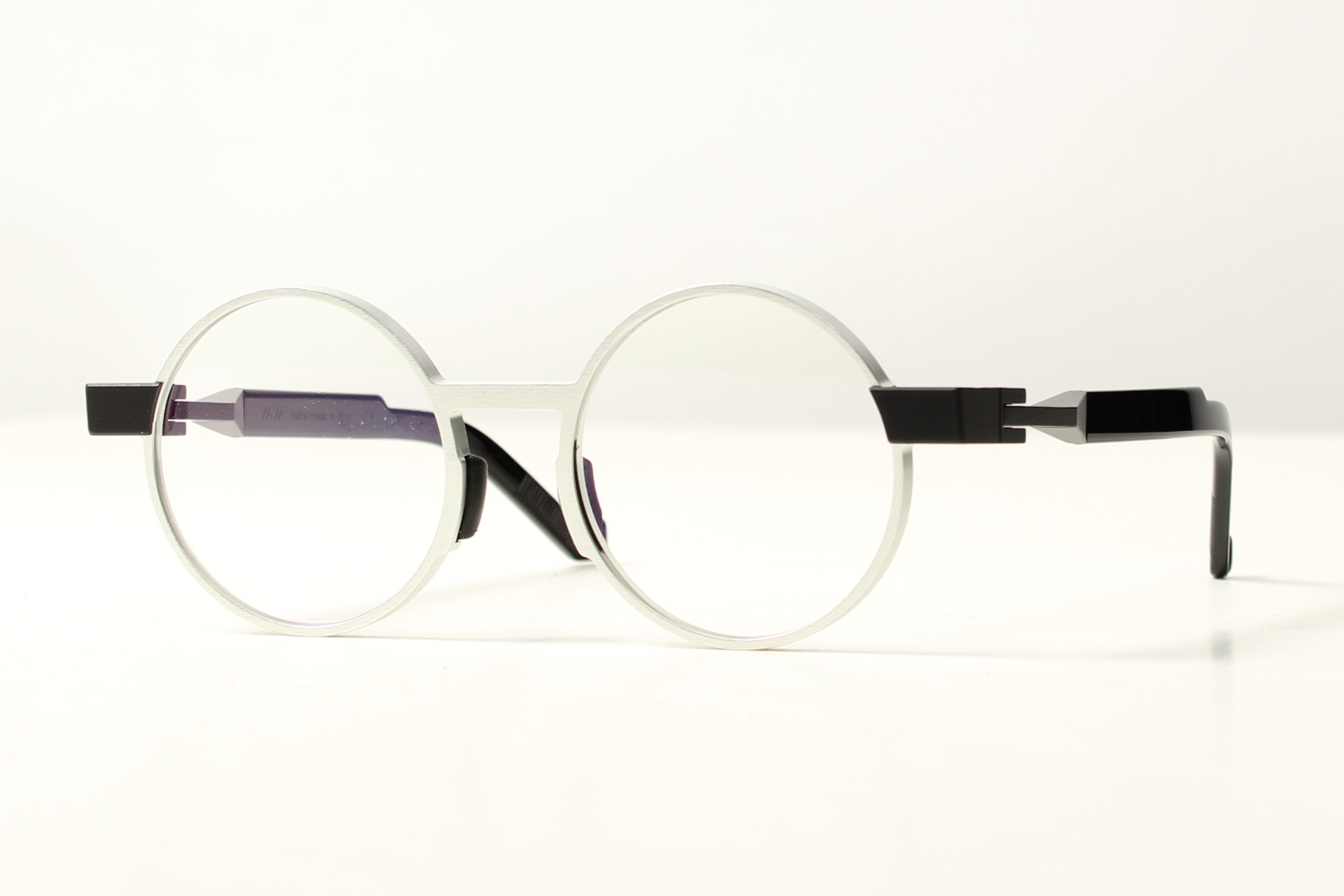 Rond VAVA-montuur in mat grijs aluminium met het kenmerkend aluminium zwart scharnier.