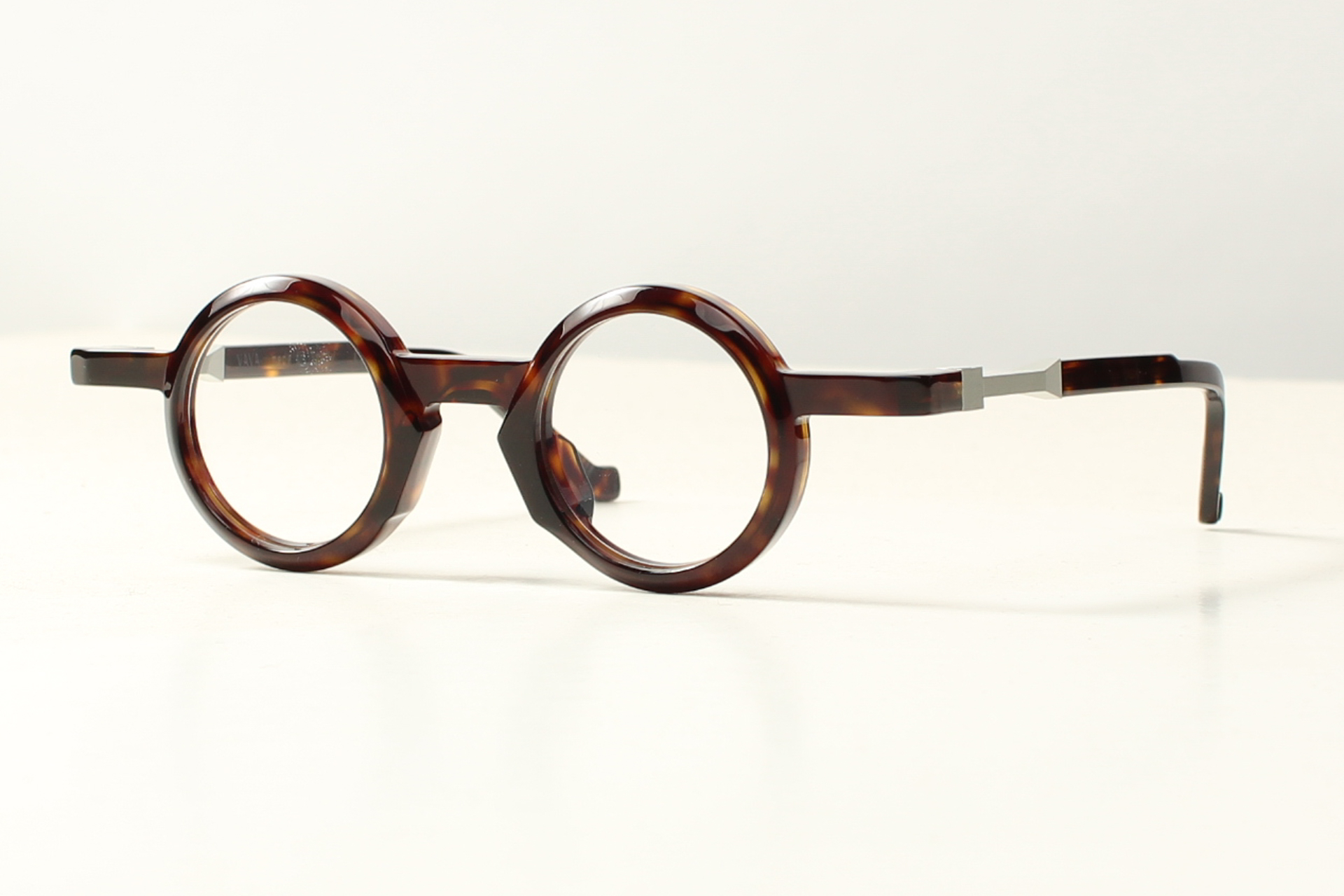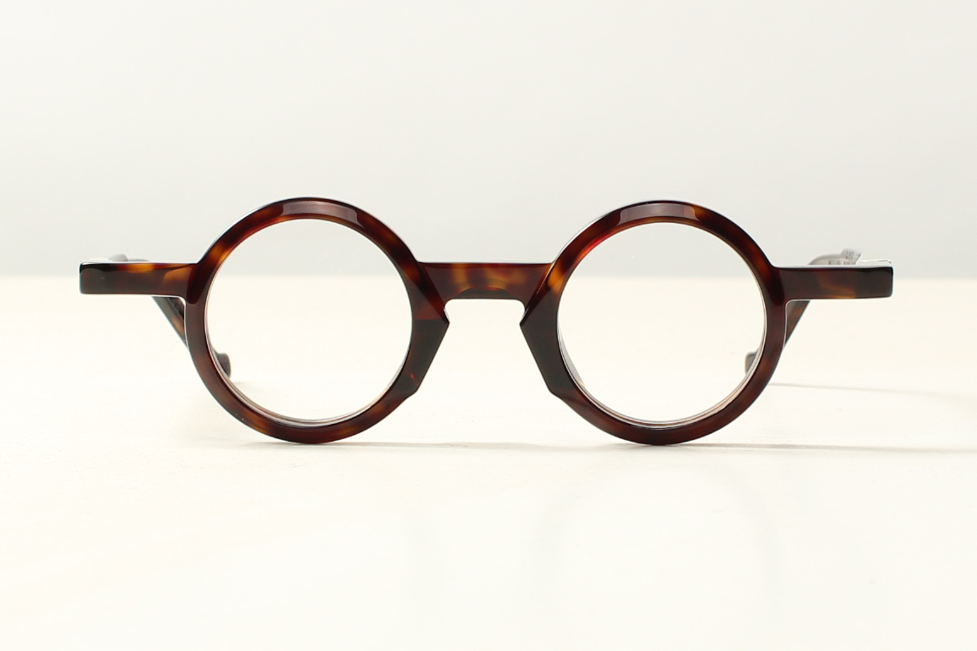 Klein rond VAVA-montuur in donker havanna acetaat met het kenmerkend aluminium scharnier.