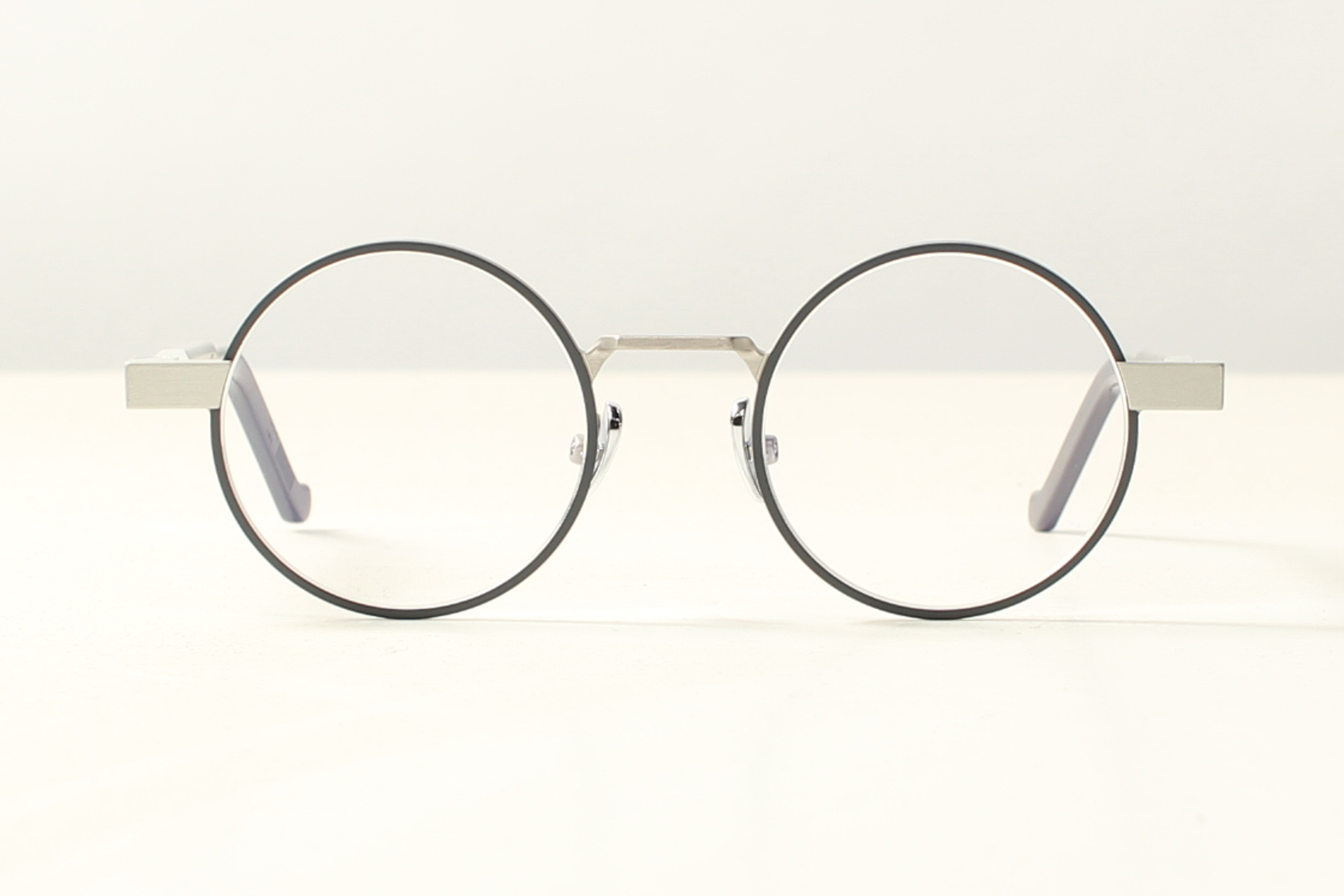 Rond VAVA-montuur in mat grijs aluminium met het kenmerkende aluminium scharnier. Handmade in Italy.