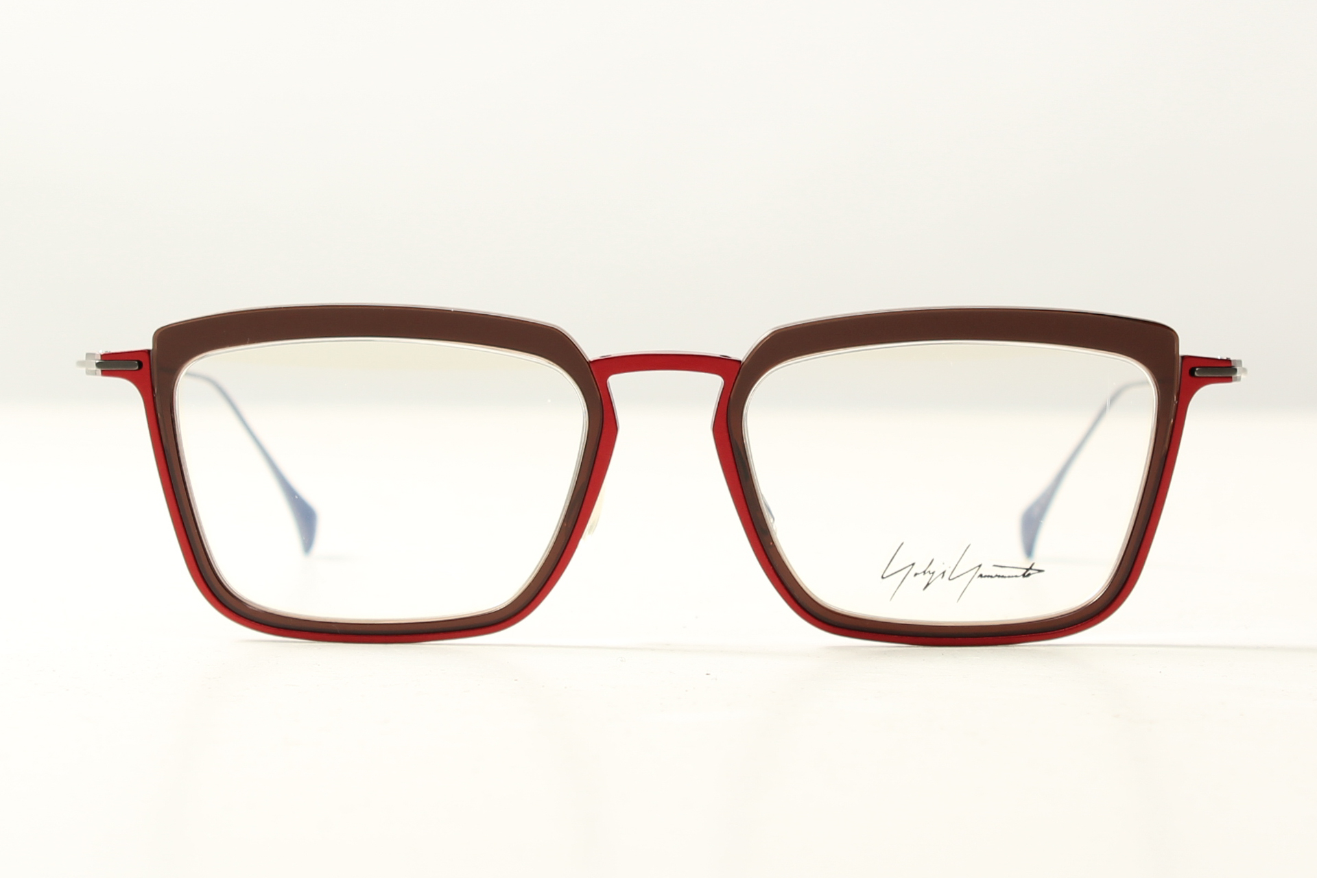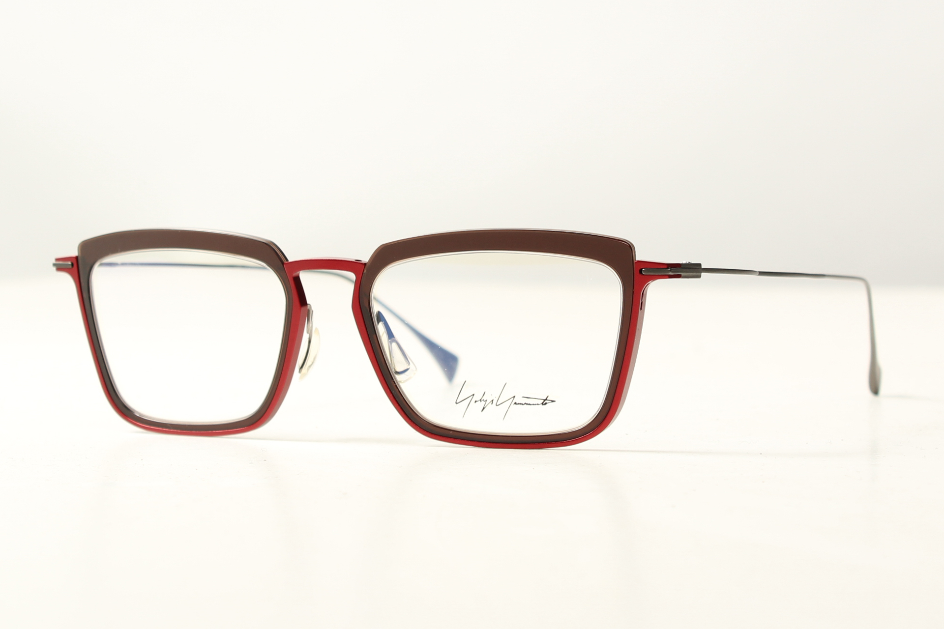 Yohji Yamamoto montuur, combinatie van design en eenvoud in combinatie van donkerrood acetaat en titanium.